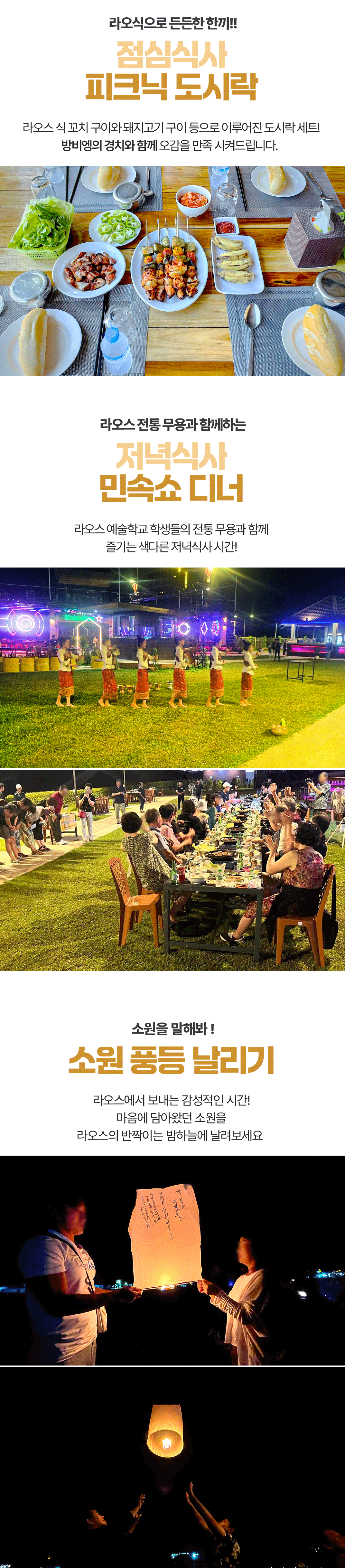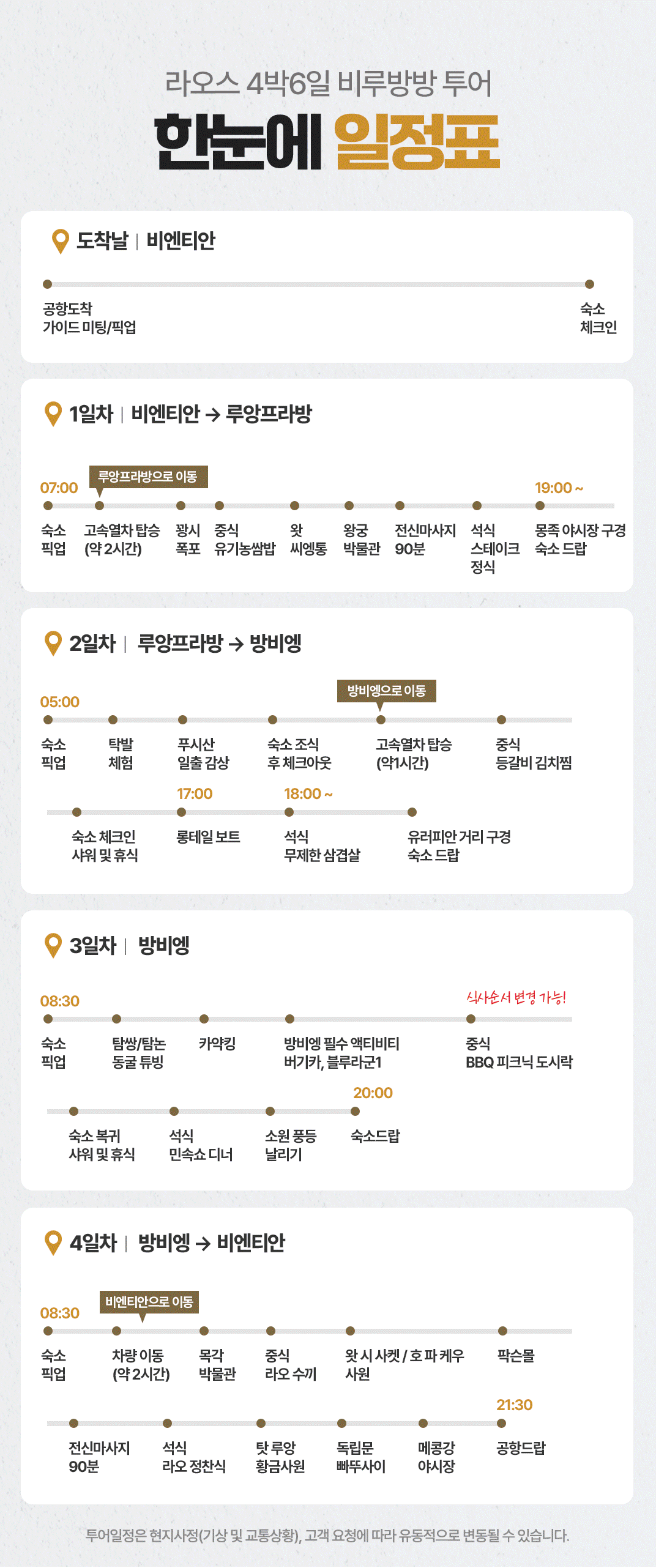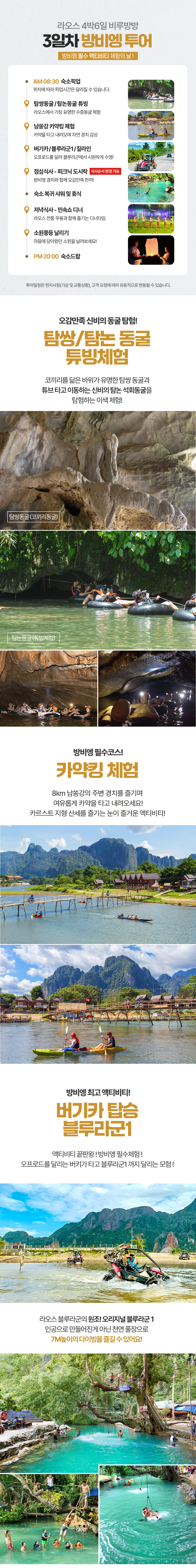 픽업(08:30) → 탐쌍 / 탐논 동굴 튜빙 → 카약킹 → 방비엥 필수 액티비티(버기카, 블루라군 1, 짚라인) → 중식 → 숙소 복귀 샤워 및 휴식 → 석식 → 소원 풍등 날리기 → 숙소드랍(20:00)