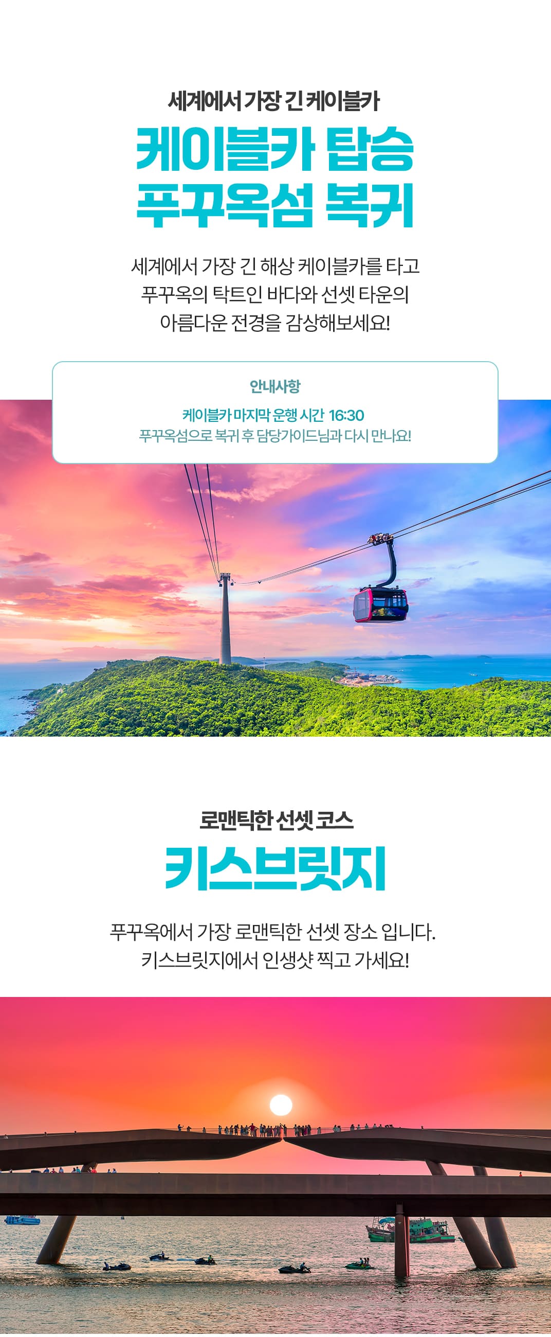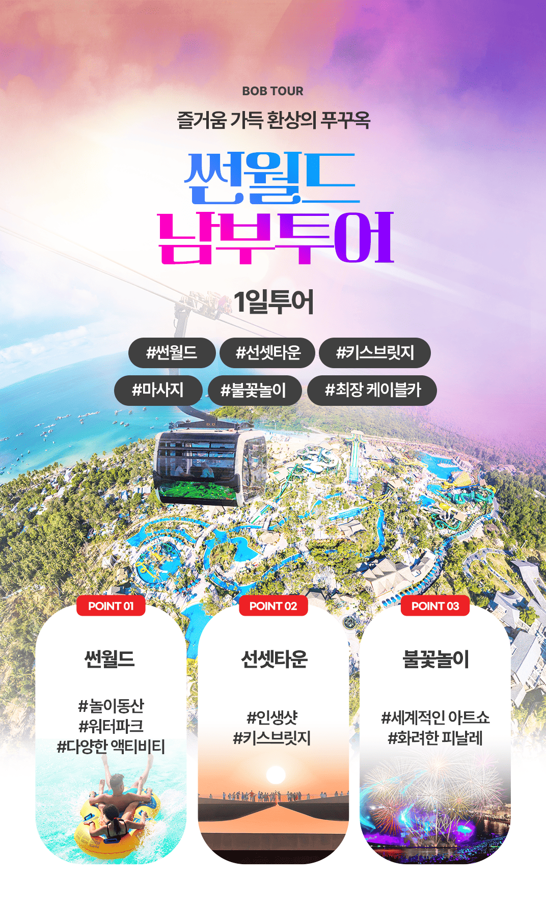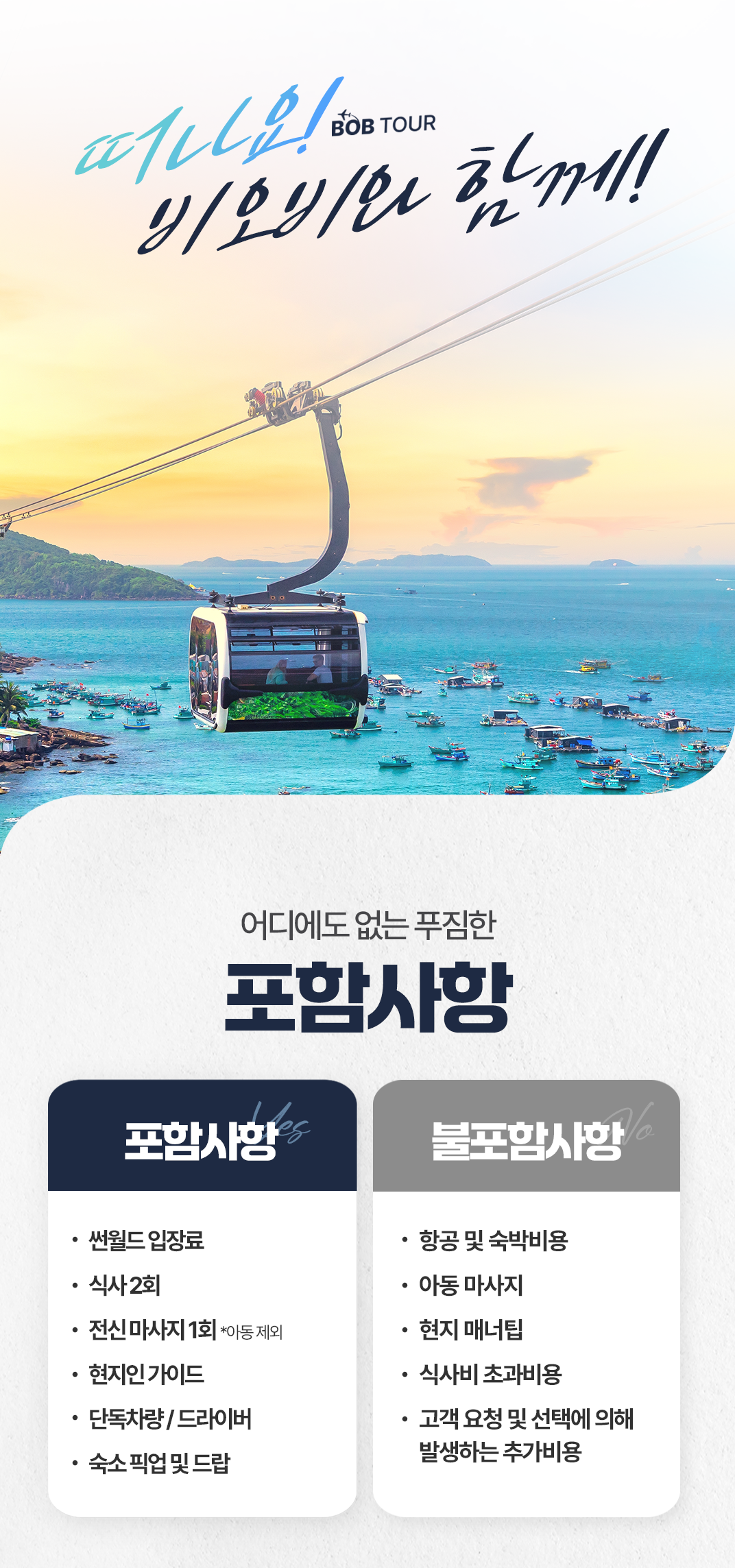 픽업(12:00) → 케이블카 이동 → 썬월드 혼똔 네이처 파크 → 점심식사 → 케이블카 복귀 → 키스 브릿지 → 마사지 90분 → 저녁식사 → 키스 오브 더 씨 → 숙소드랍 (22:00)