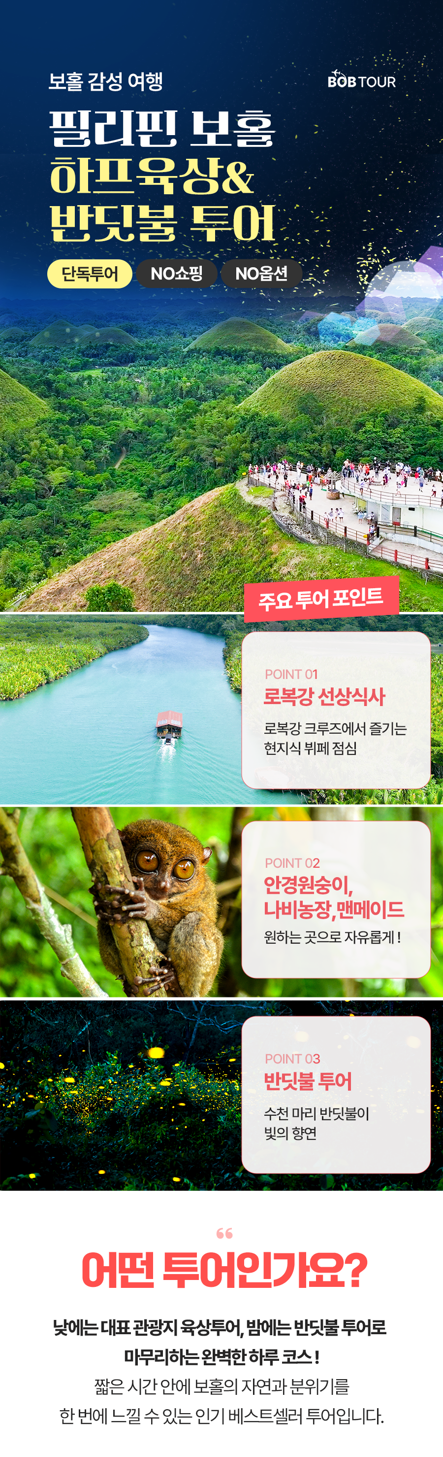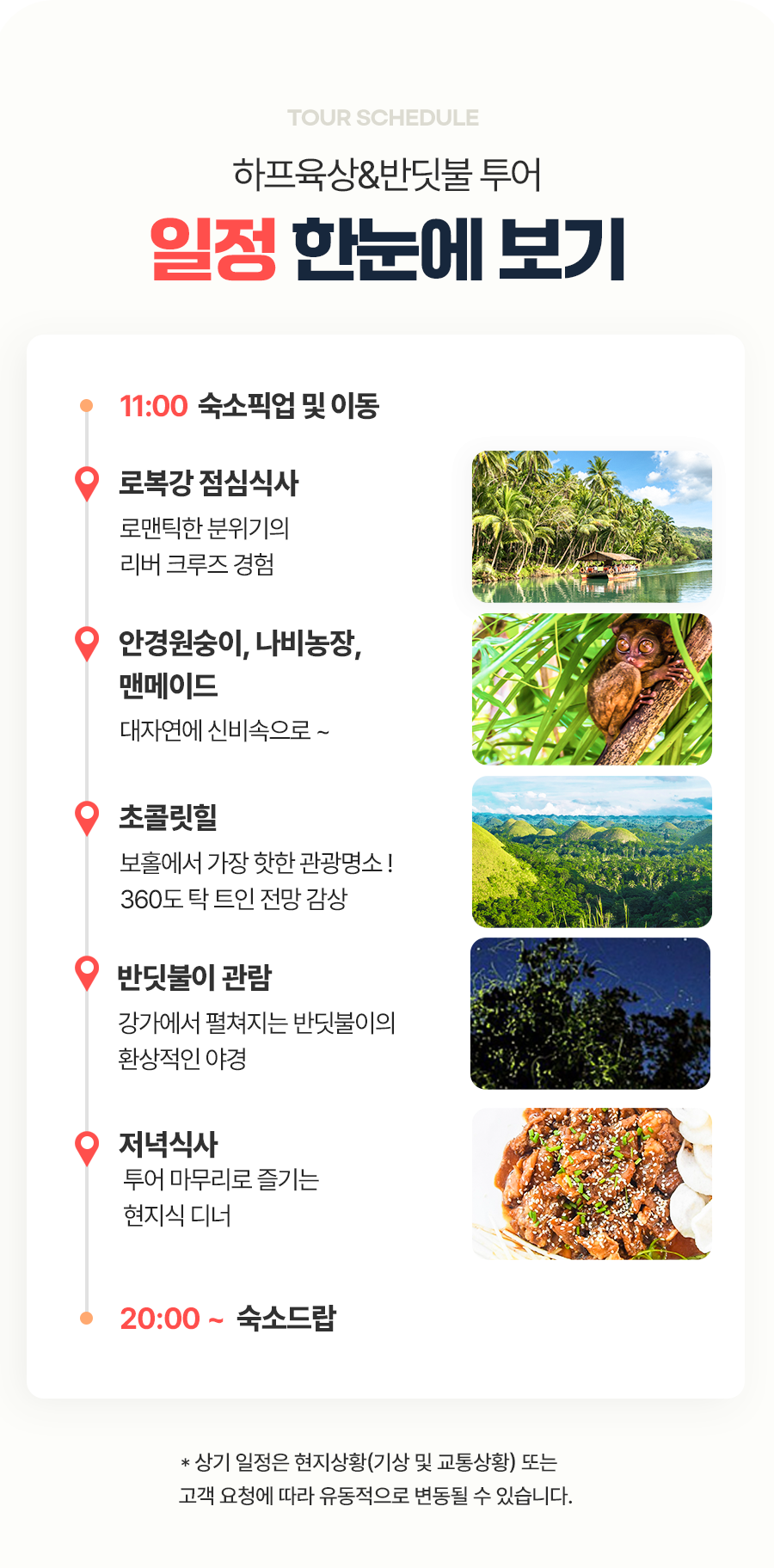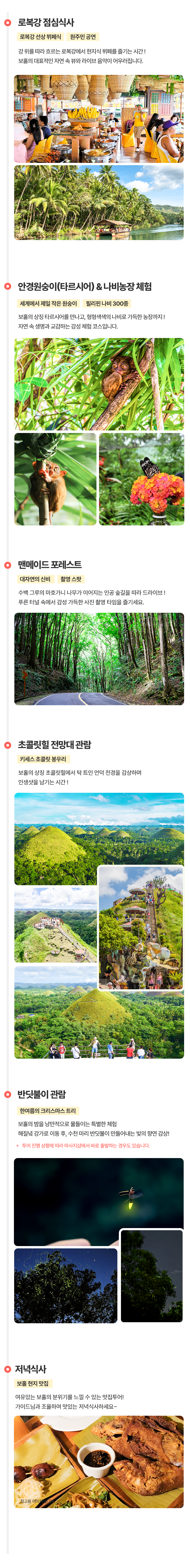 픽업(11:00) → 로복강 선상뷔페 점심식사 → 뱀,나비농장 → 맨메이드 → 안경원숭이 → 초콜릿힐 →반딧불 와칭 → 저녁식사→ 전신마사지 90분 → 공항 혹은 리조트 드랍