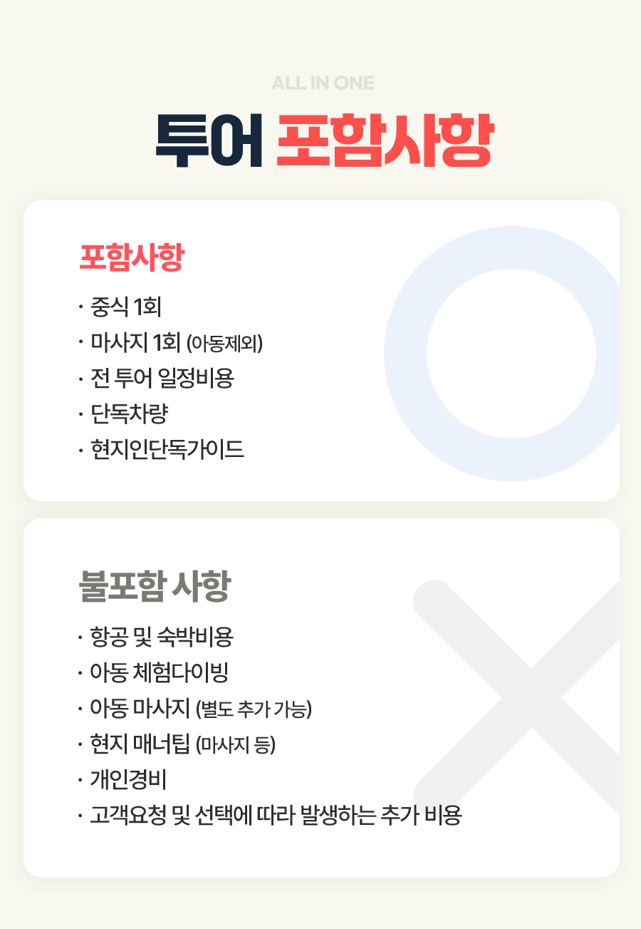 무료제공 다이빙 장비 (다이빙수트,산소통등) , 전신마사지 90분 (오일 또는 드라이 선택 가능) , 망고, 1인 1컵라면, 1인당 1타월