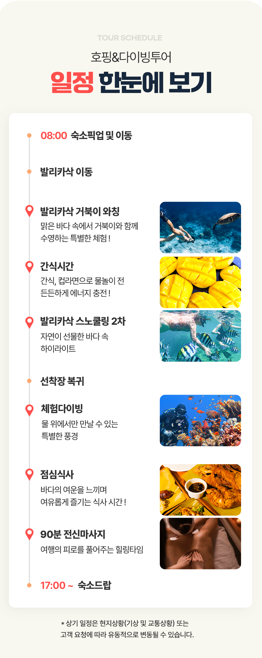 픽업(09:00PM) → 발리카삭 거북이 와칭 → 컵라면 & 망고 간식 서비스 → 열대어스노쿨링 →체험다이빙 → 점심 식사 → 90분 전신 마사지 → 리조트 드랍
