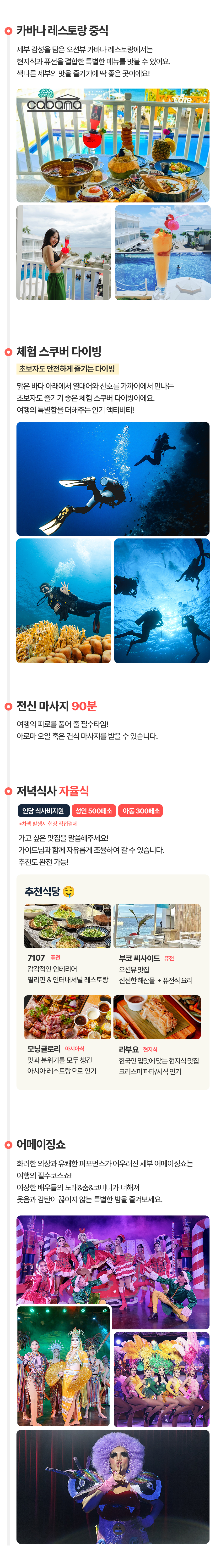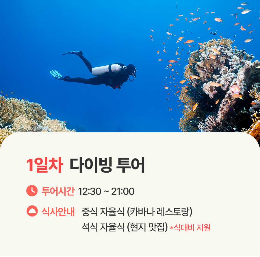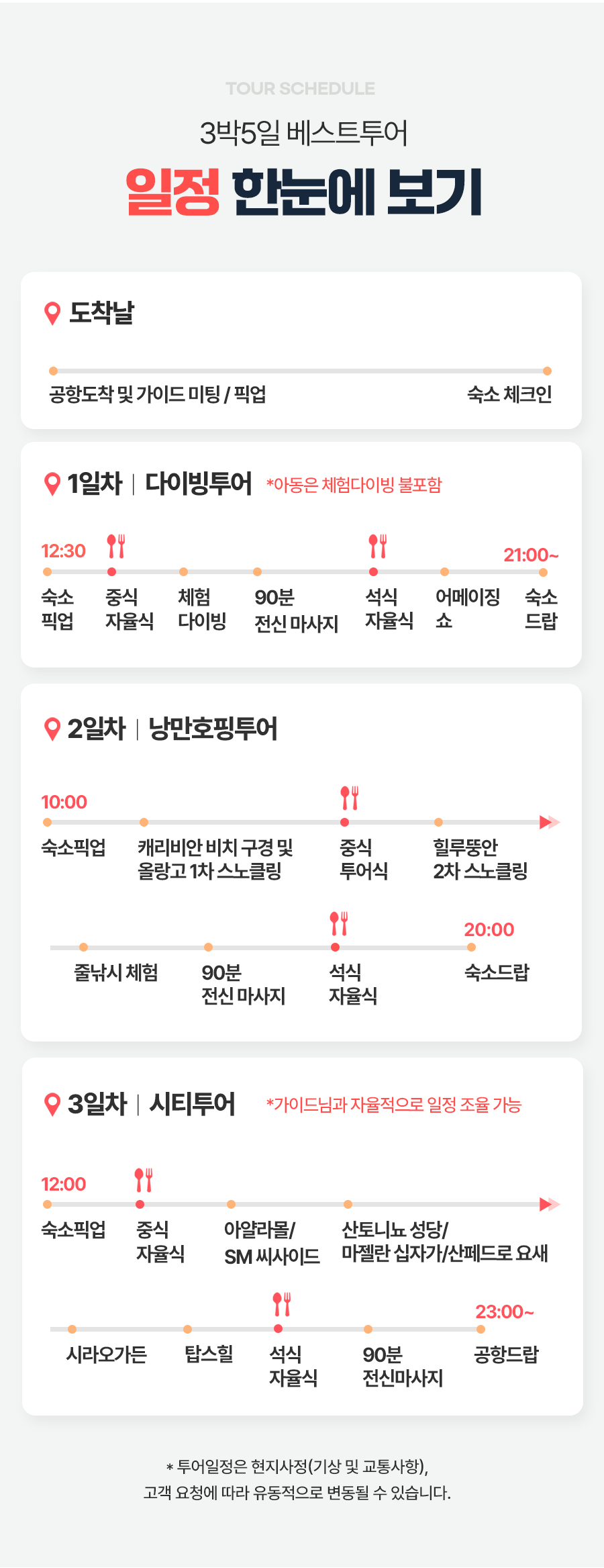 픽업(12:30) → 점심식사 → 환전 및 현지마트 → 스쿠버 체험다이빙 → 전신마사지 90분 → 저녁식사 → 어메이징쇼 관람 → 드랍(21:00)