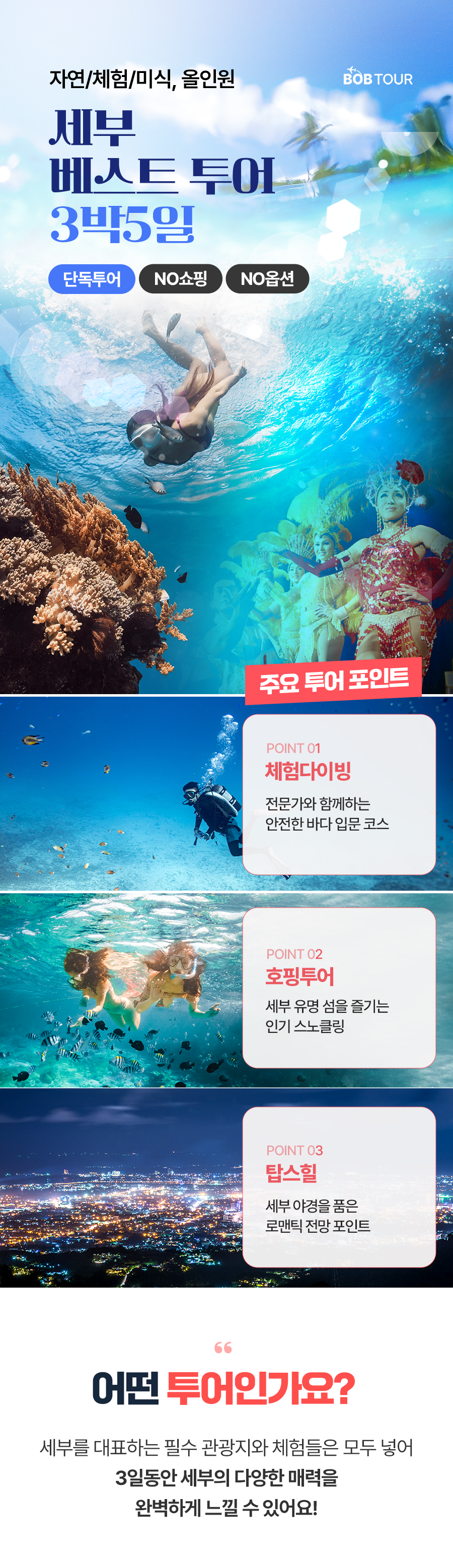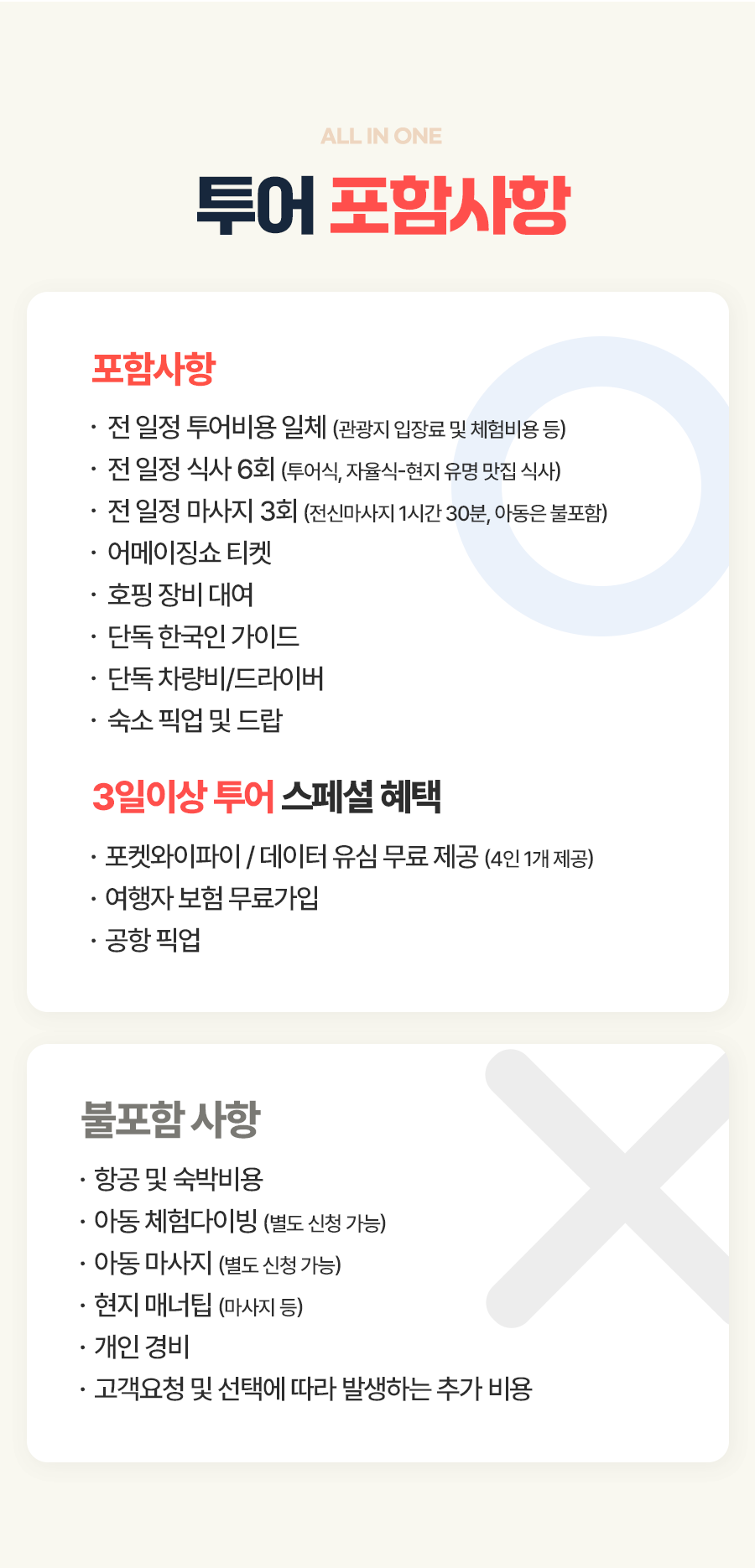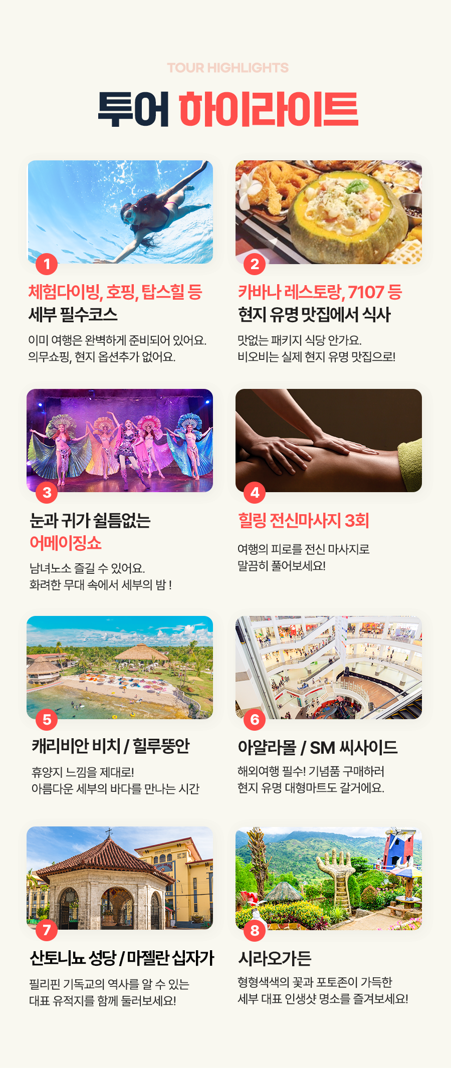픽업(12:30) → 점심식사 → 환전 및 현지마트 → 스쿠버 체험다이빙 → 전신마사지 90분 → 저녁식사 → 어메이징쇼 관람 → 드랍(21:00)