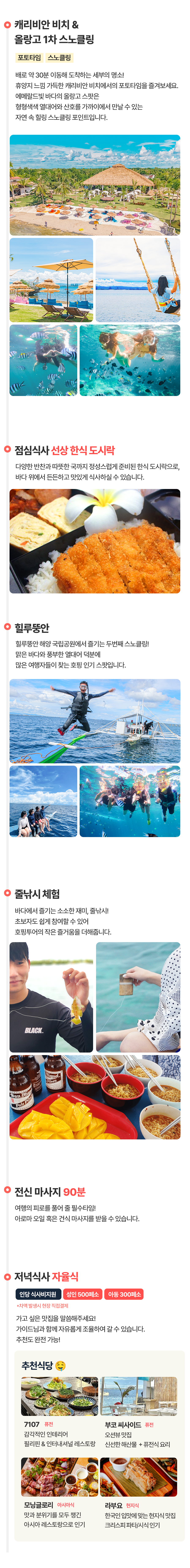픽업(10:00) → 1차 스노쿨링(날루수안) → 점심식사 → 2차 스노쿨링(힐루뚱안) → 전신마사지 90분 → 저녁식사 → 드랍(21:30)