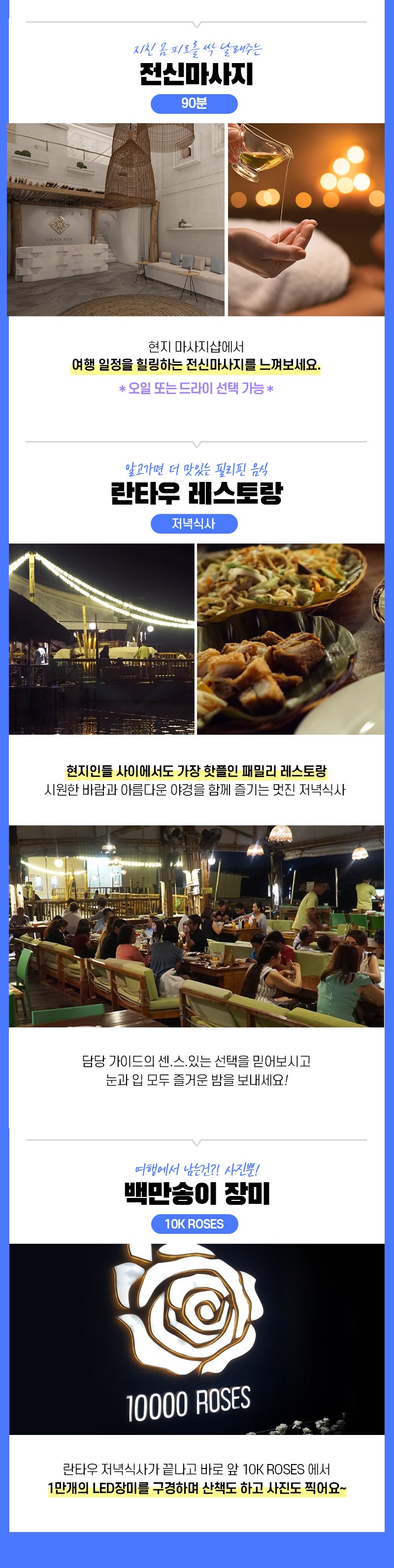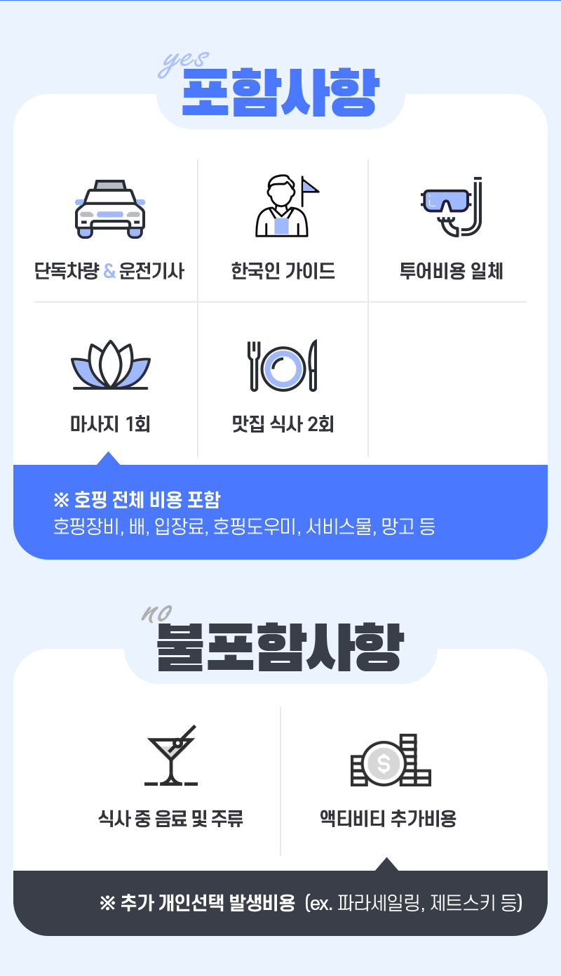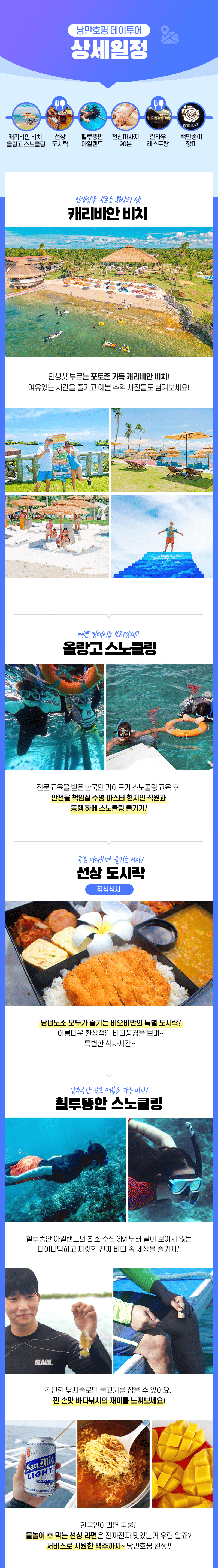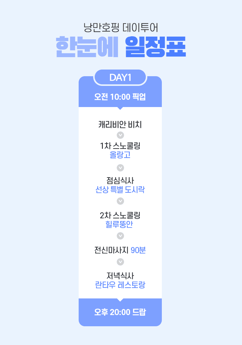 픽업(10:00) → 1차 스노쿨링(날루수안) → 점심식사 → 2차 스노쿨링(힐루뚱안) → 전신마사지 90분 → 저녁식사 → 드랍(21:30)