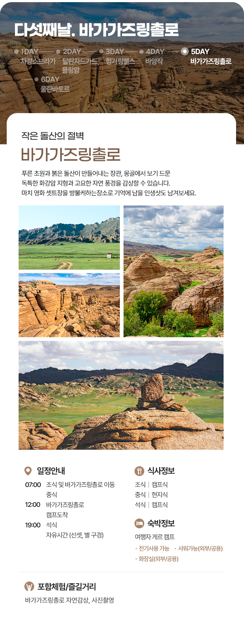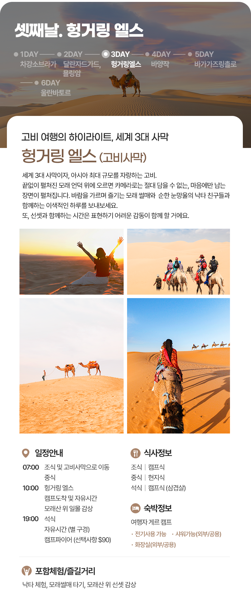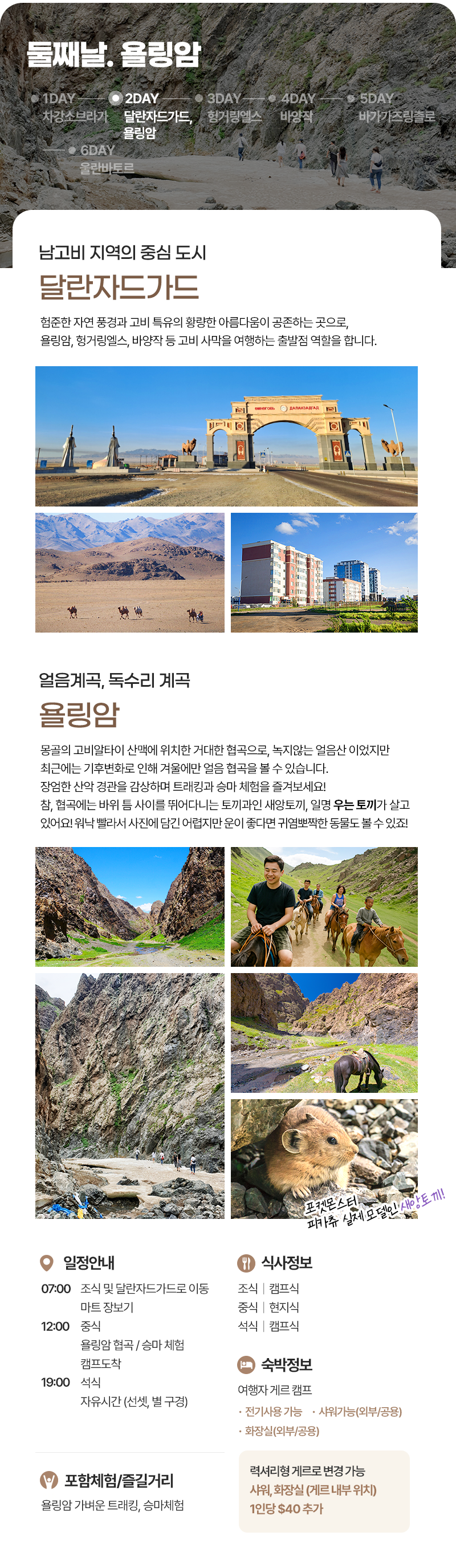 조식(07:00) → 달란자드가드로 이동 및 마트 장보기 → 중식(캠프식) → 욜링암 협곡, 승마체험 → 캠프도착 및 자유시간 → 석식(캠프식) → 자유시간 (선셋 및 별구경) → 캠프파이어(선택사항)