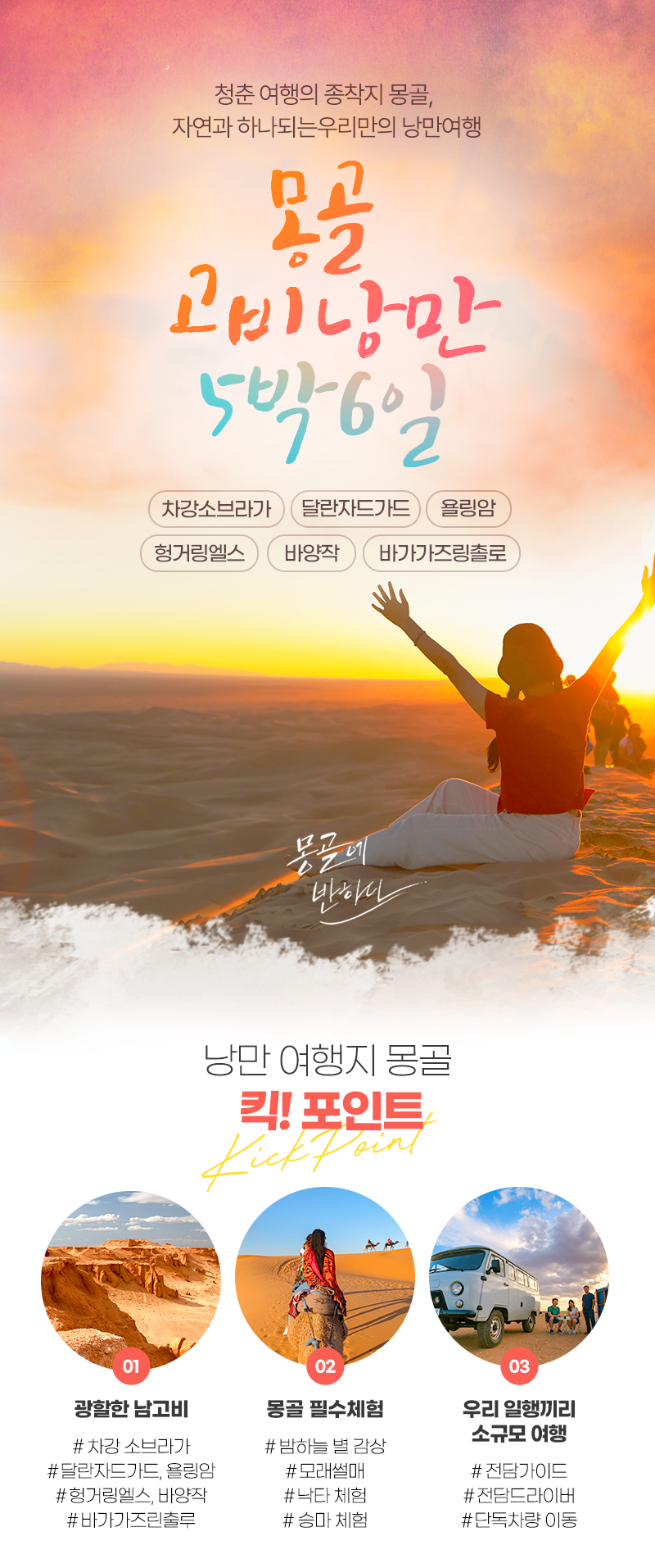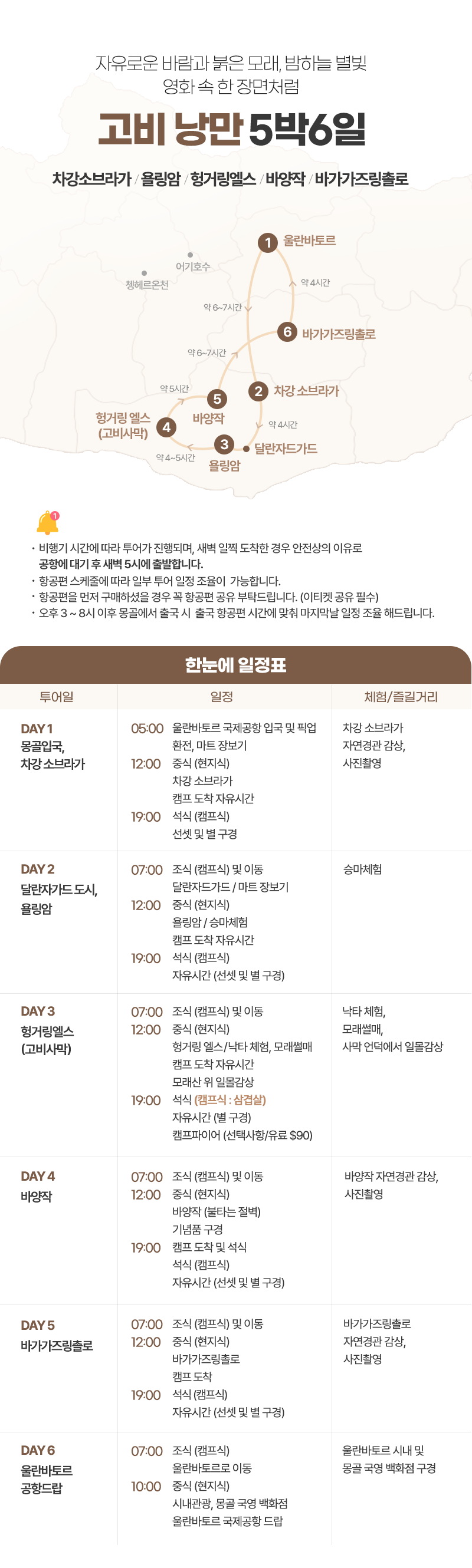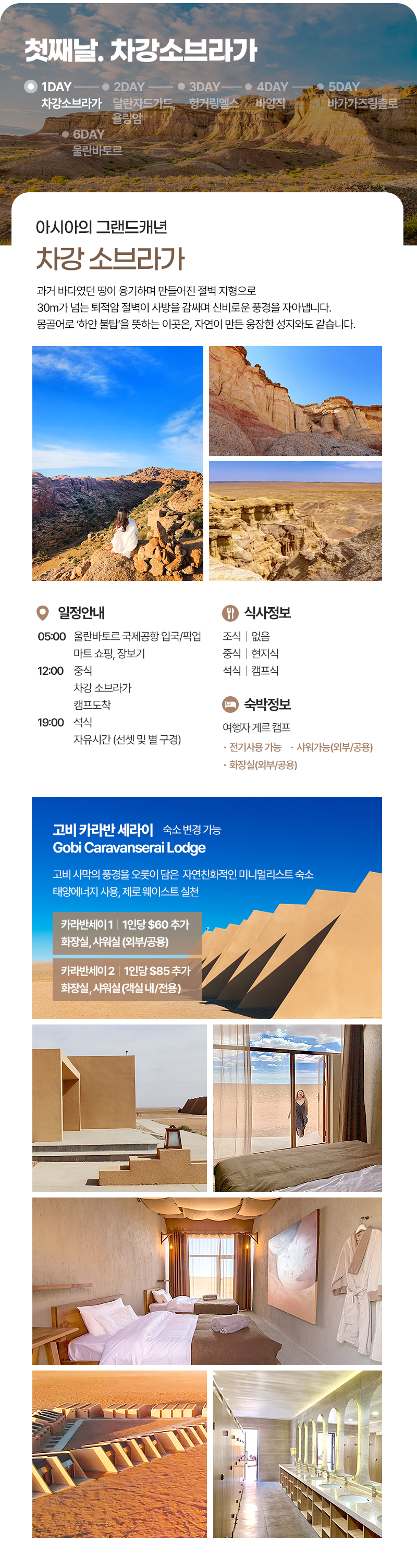 공항 픽업(05:00) → 환전 및 마트 장보기 → 중식(현지식) → 차강소브라가 도착 → 캠프도착 및 자유시간 → 석식(캠프식) → 자유시간 (선셋 및 별구경)