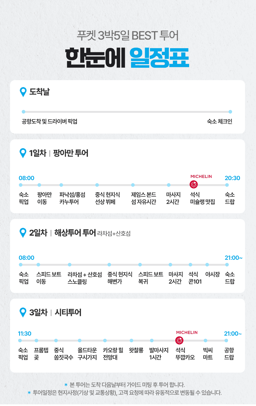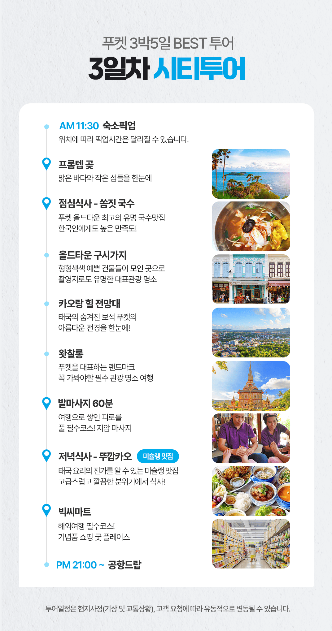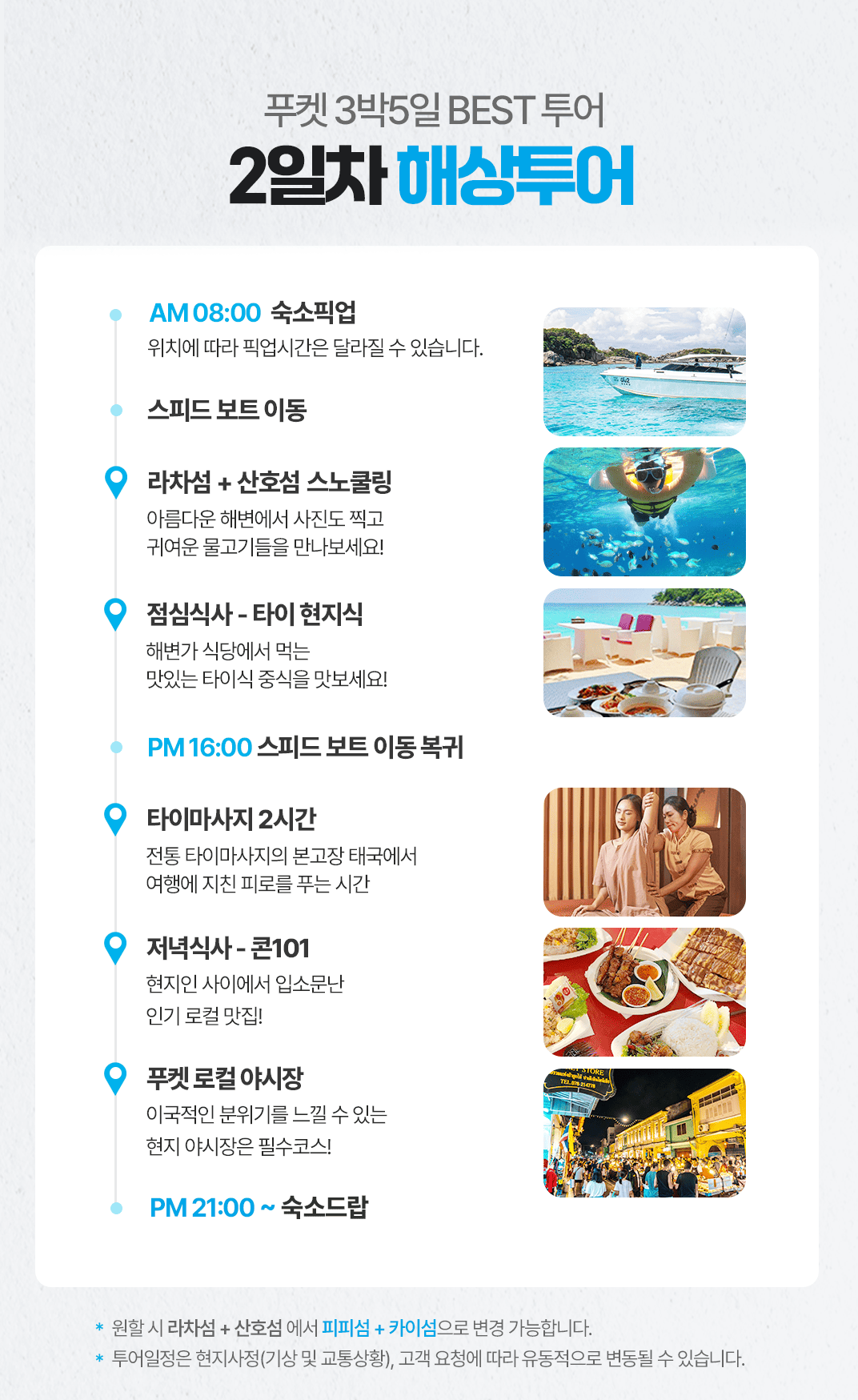 픽업(08:00) → 스피드보트 이동→라차섬+산호섬 스노쿨링→점심식사→스피드 보트 이동 복귀→타이마사지 2시간→저녁식사→푸켓 로컬 야시장→숙소드랍