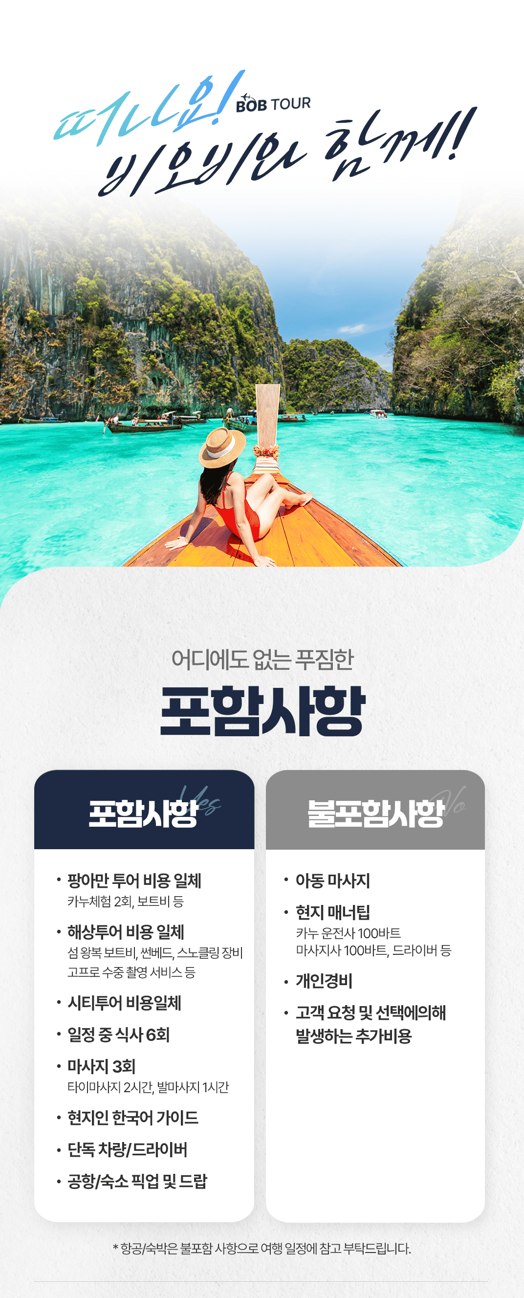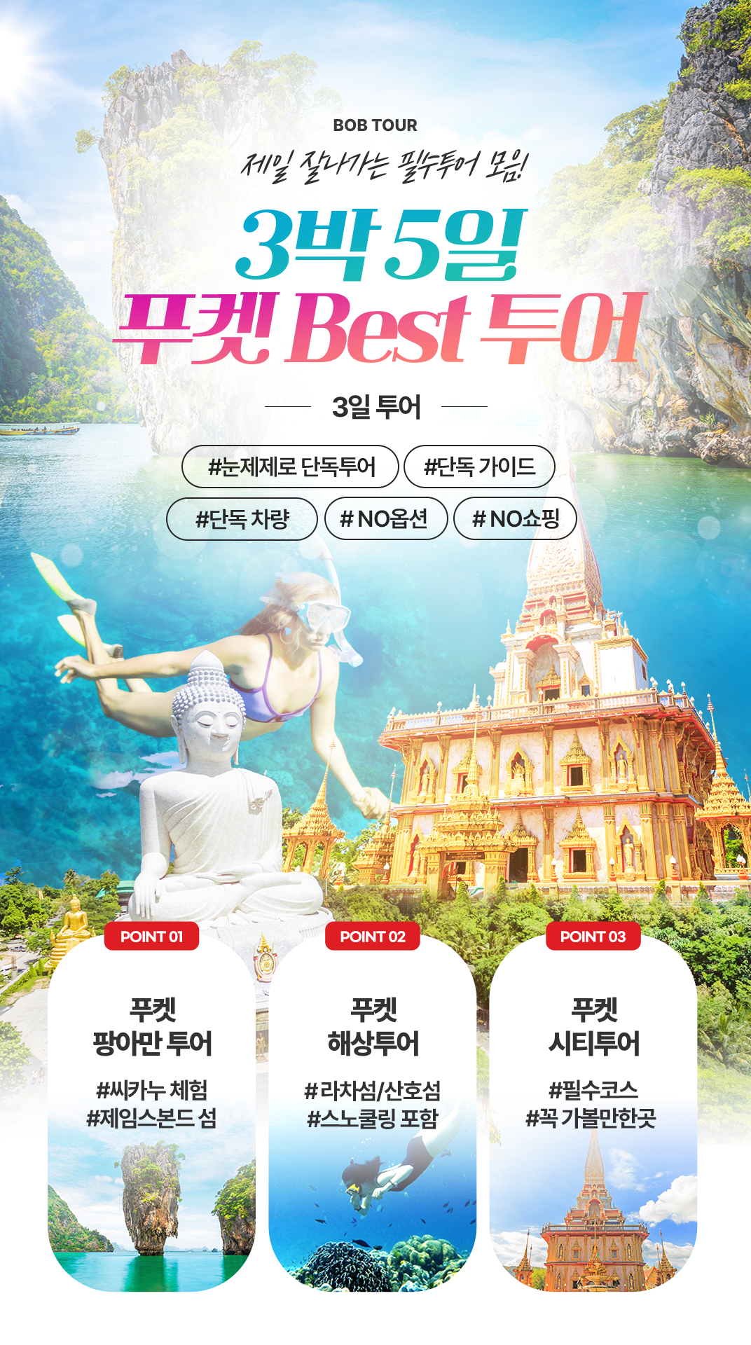 픽업(08:00) → 선착장>팡아만 해양 국립 공원 이동 → 파낙섬/홍섬 카누 투어→ 점심식사(현지식) → 제임스본드 섬 자유시간 →선착장 복귀(16:00) →타이마사지 2시간 →저녁식사(RAYA또는 원춘레스토랑) →숙소 드랍
