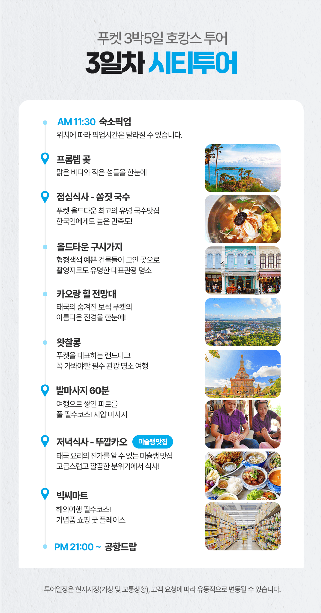 픽업(11:30) → 프롬텝곶 → 점심식사 → 올드타운 구시가지→카오랑 힐 전망대→왓찰롱→ 발마사지 60분→ 저녁식사→빅씨마트→ 공항드랍