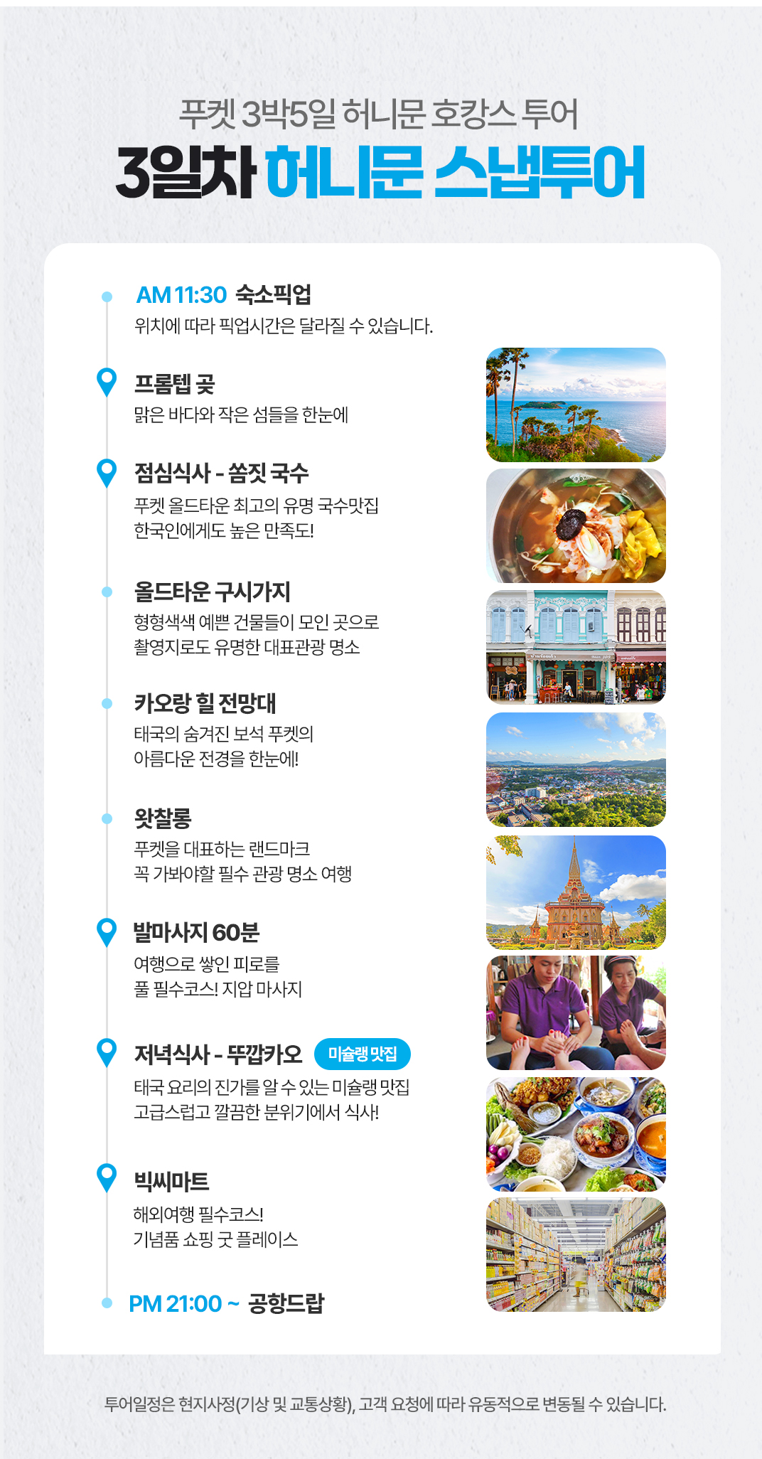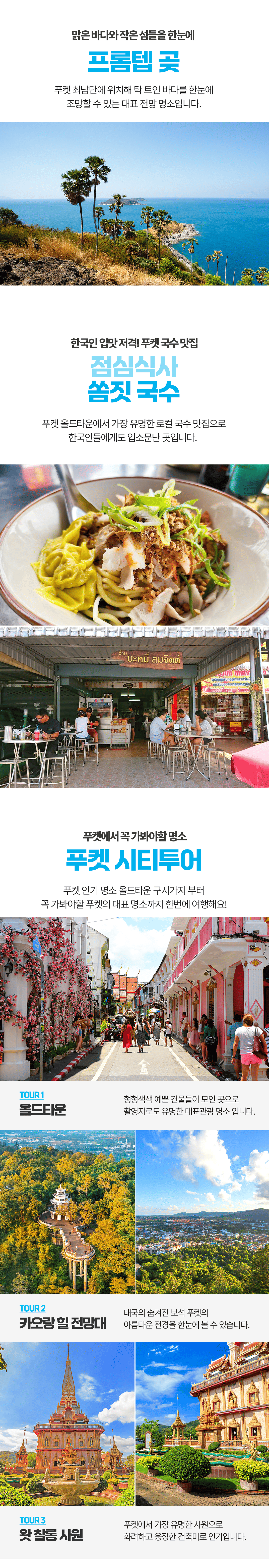 픽업(11:30) → 프롬뎁곶→ 점심식사 →올드타운 구시가지→카오랑 힐 전망대→왓찰롱→발마사지 60분→ 저녁식사→ 빅씨마트→ 공항드랍