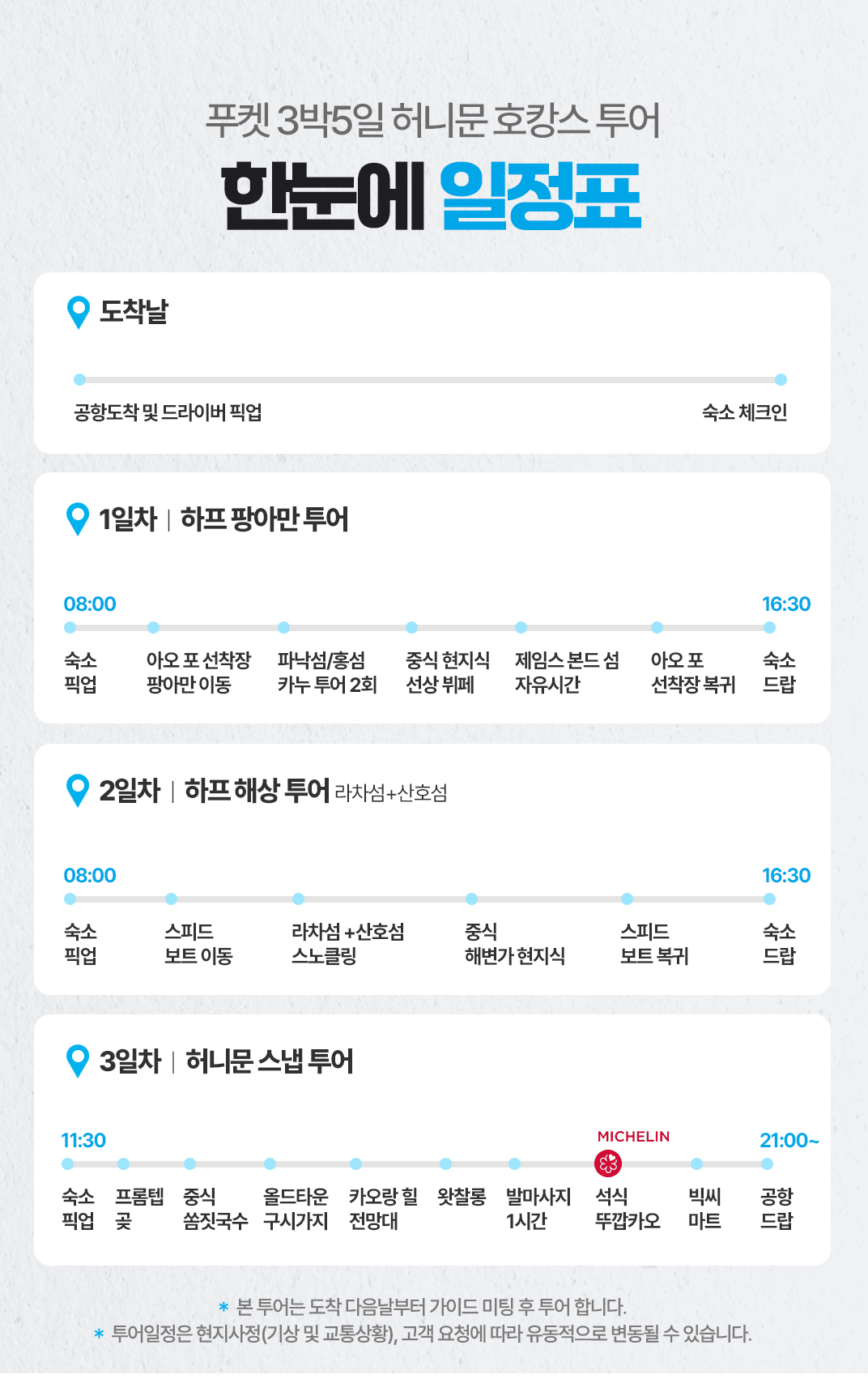 픽업(08:00) → 선착장>팡아만 해양 국립 공원 이동 → 파낙섬/홍섬 카누 투어→ 점심식사(현지식) → 제임스본드 섬 자유시간 →선착장 복귀(16:00) → 숙소 드랍