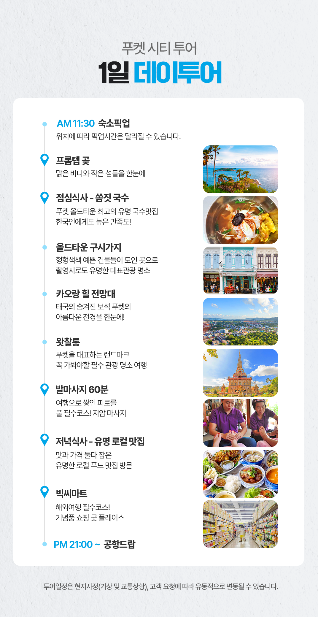 픽업(11:30) → 점심식사 →푸켓 시티투어→올드타운 구시가지→카오랑 힐 전망대→왓찰롱/빅부다/프롬텝 곶→발마사지 60분→ 저녁식사→ 빅씨마트→공항드랍