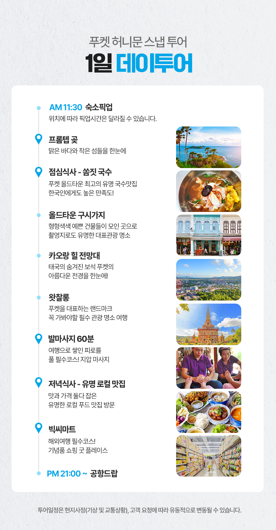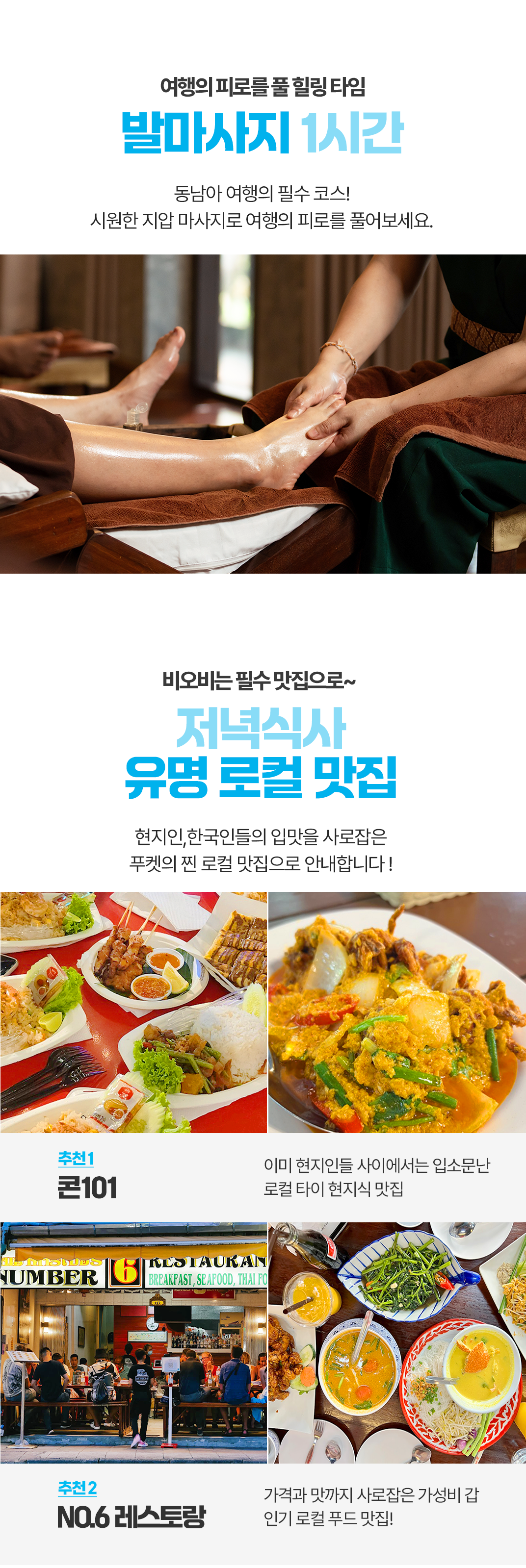 픽업(11:30) → 프롬텝 곶 → 점심식사 →올드타운 구시가지→카오랑 힐 전망대→왓찰롱→발마사지 60분→저녁식사→ 빅씨마트→공항드랍