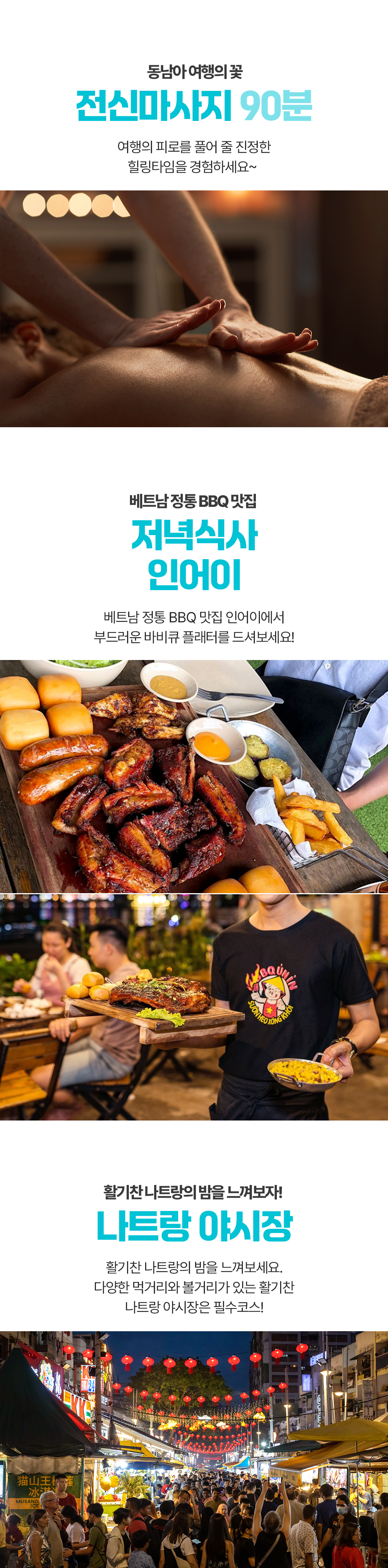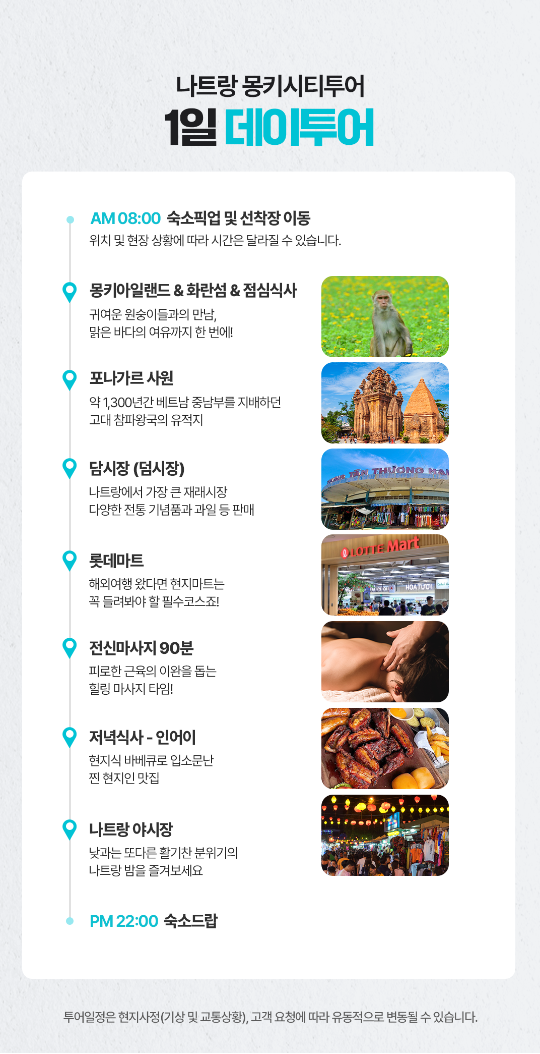 08:00픽업 → 몽키아일랜드&화란섬 → 중식(투어식) → 포나가르 사원 → 담시장 → 롯데마트 → 전신마사지90분 → 저녁식사 → 야시장 → 드랍