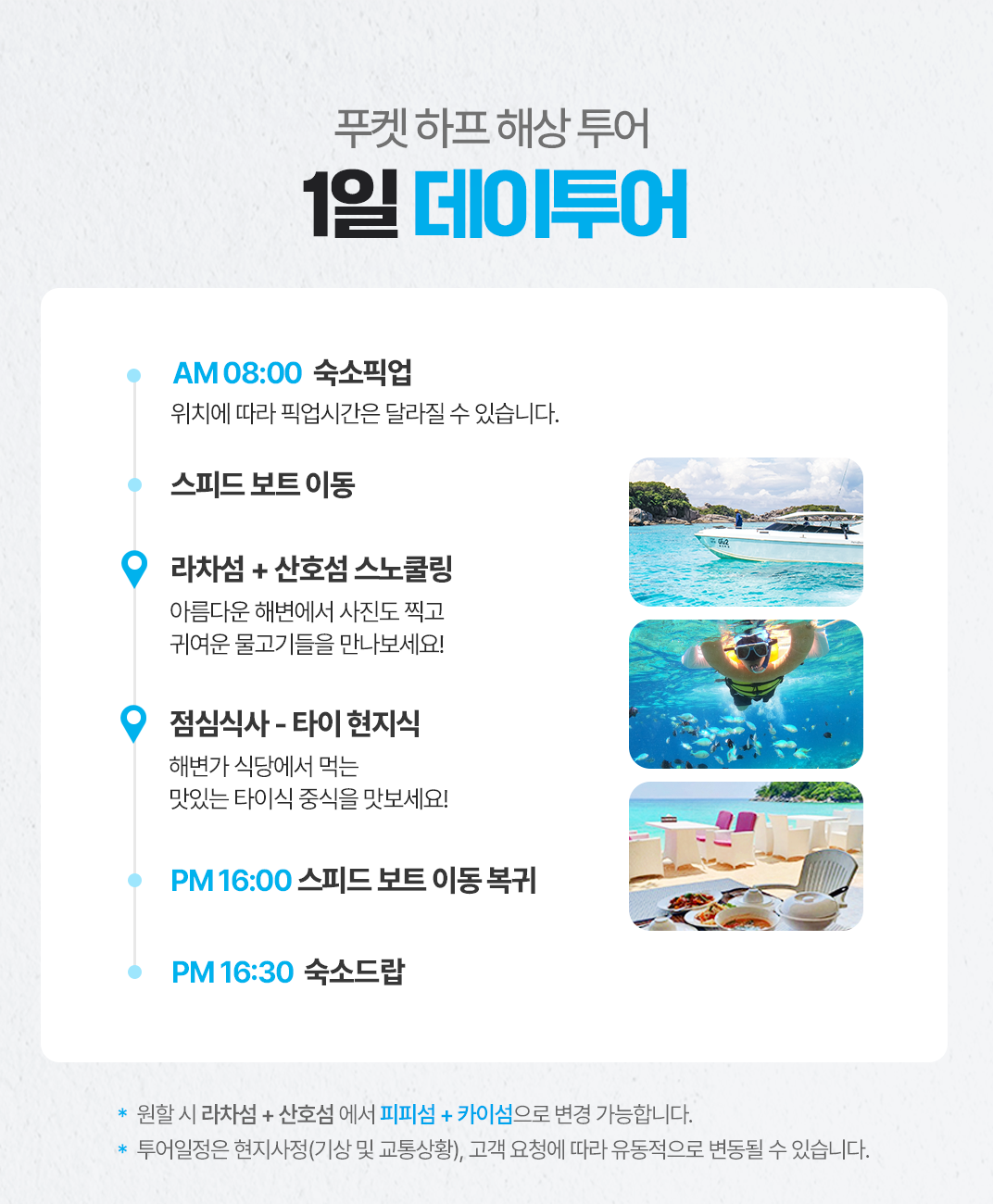 픽업(08:00) → 스피드보트 이동→라차섬+산호섬 스노쿨링→점심식사→스피드 보트 이동 복귀→숙소드랍
