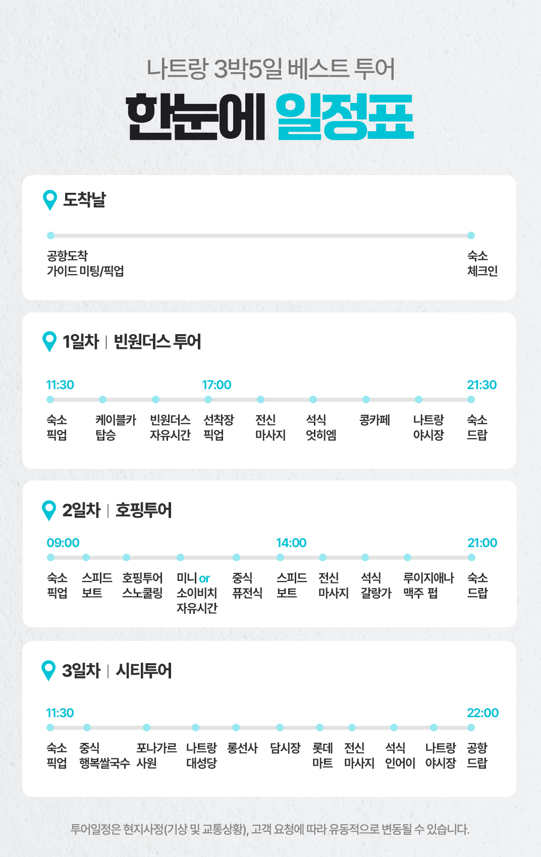 📢 나트랑 시내 숙소 기준이며 깜란지역, 혼총지역, 빈펄섬 지역은 픽드랍 추가금이 발생합니다.