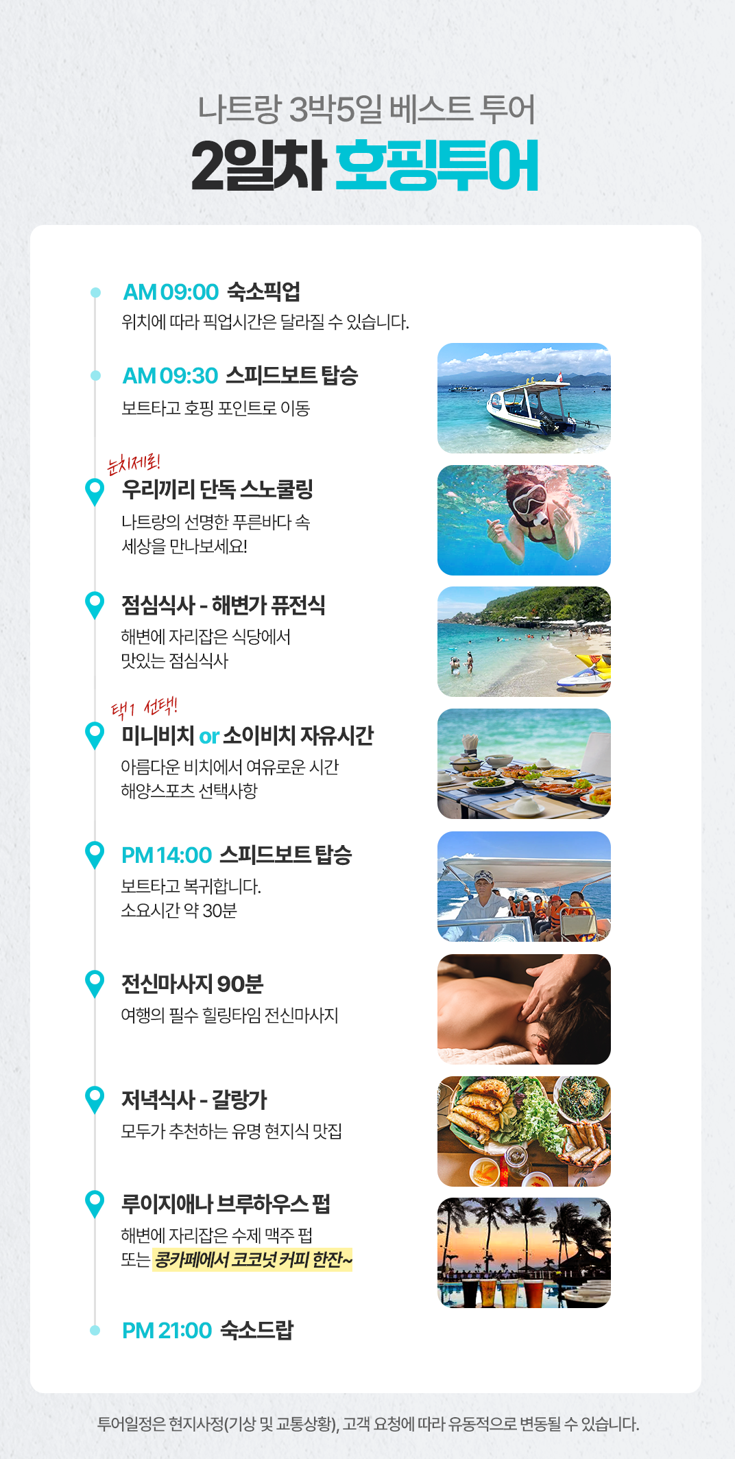 픽업(09:00) → 스노클링 및 섬 내 중식(09:00~13:30)→마사지(13:30~16:00)→석식(16:00~18:00)→루이지애나 펍(18:00~20:00)→숙소드랍