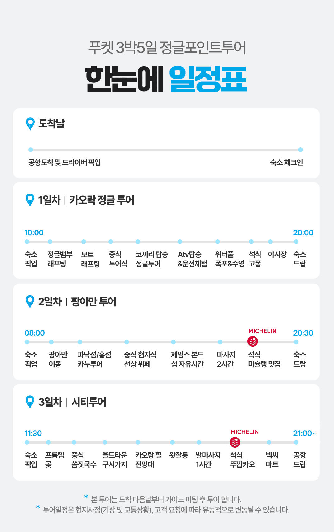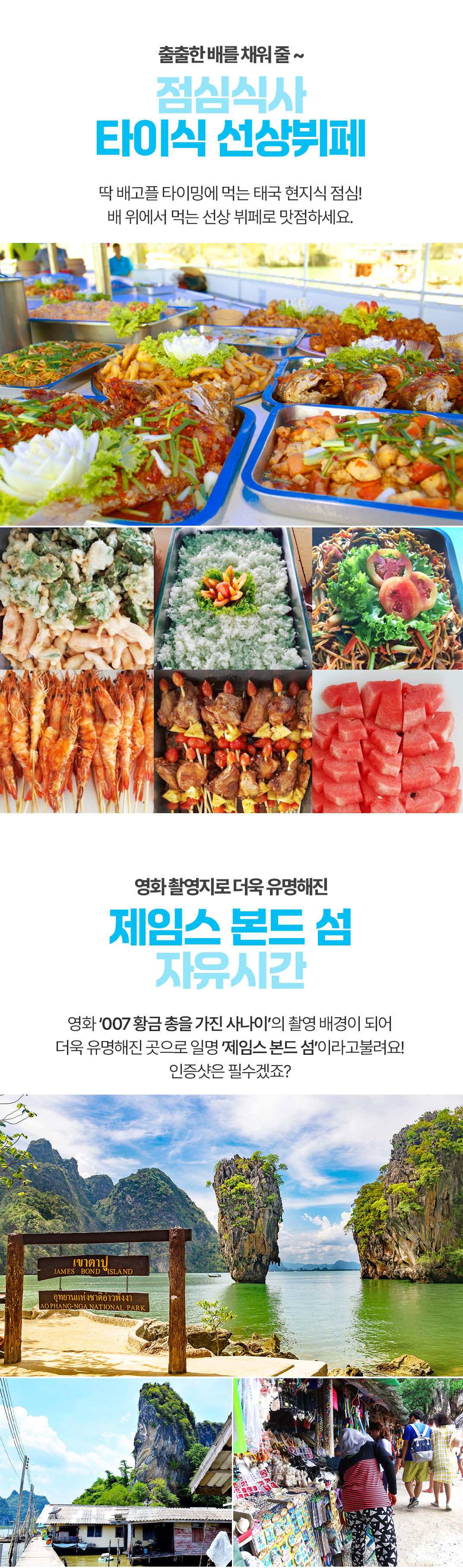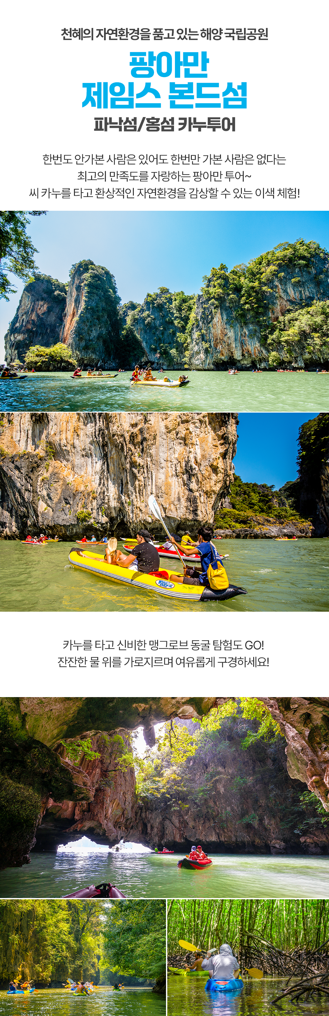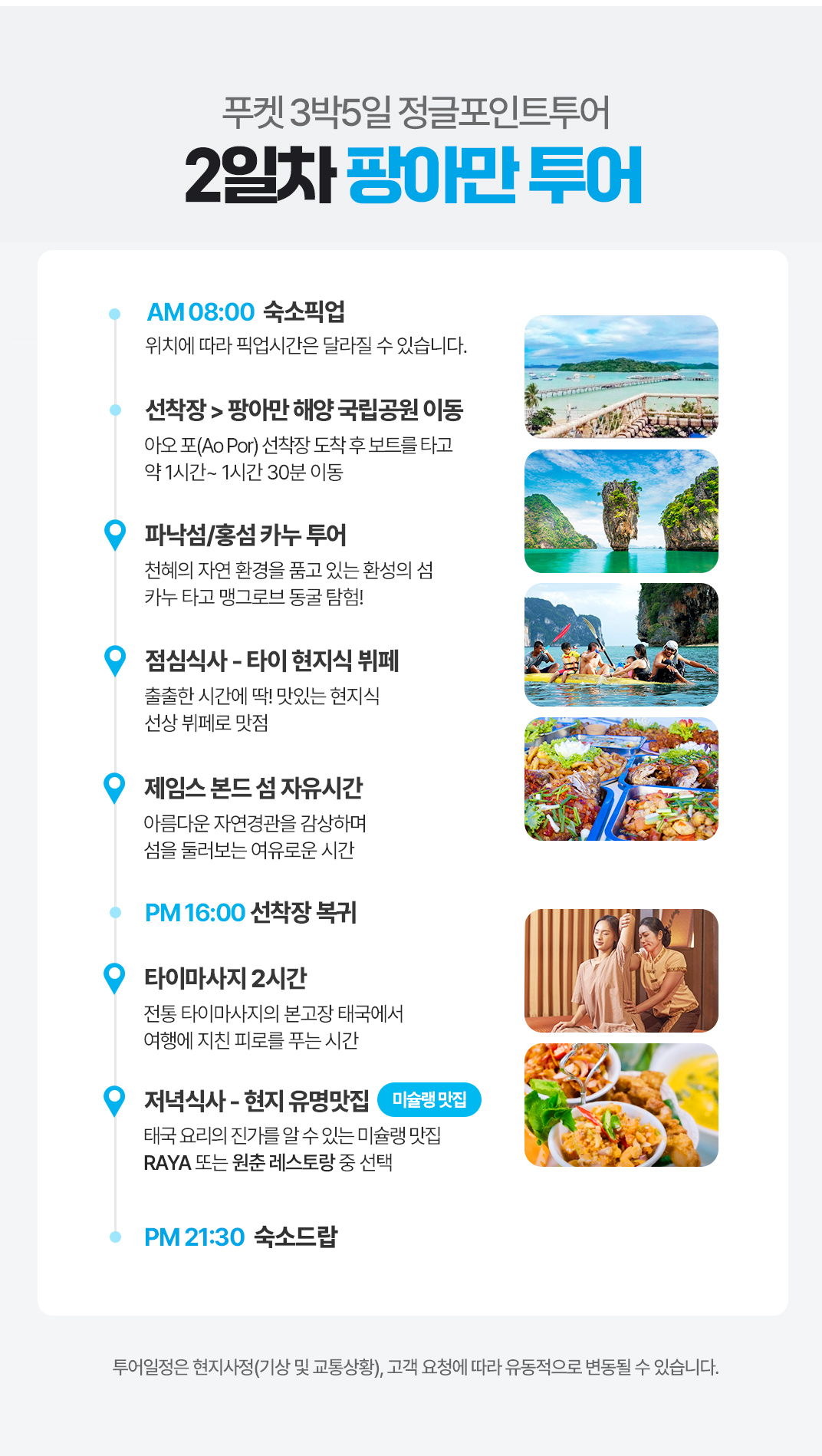 픽업(08:00) → 선착장>팡아만 해양 국립 공원 이동 → 파낙섬/홍섬 카누 투어→ 중식→ 제임스본드 섬 자유시간 →선착장 복귀(16:00) →타이마사지 2시간 → 석식 → 숙소 드랍