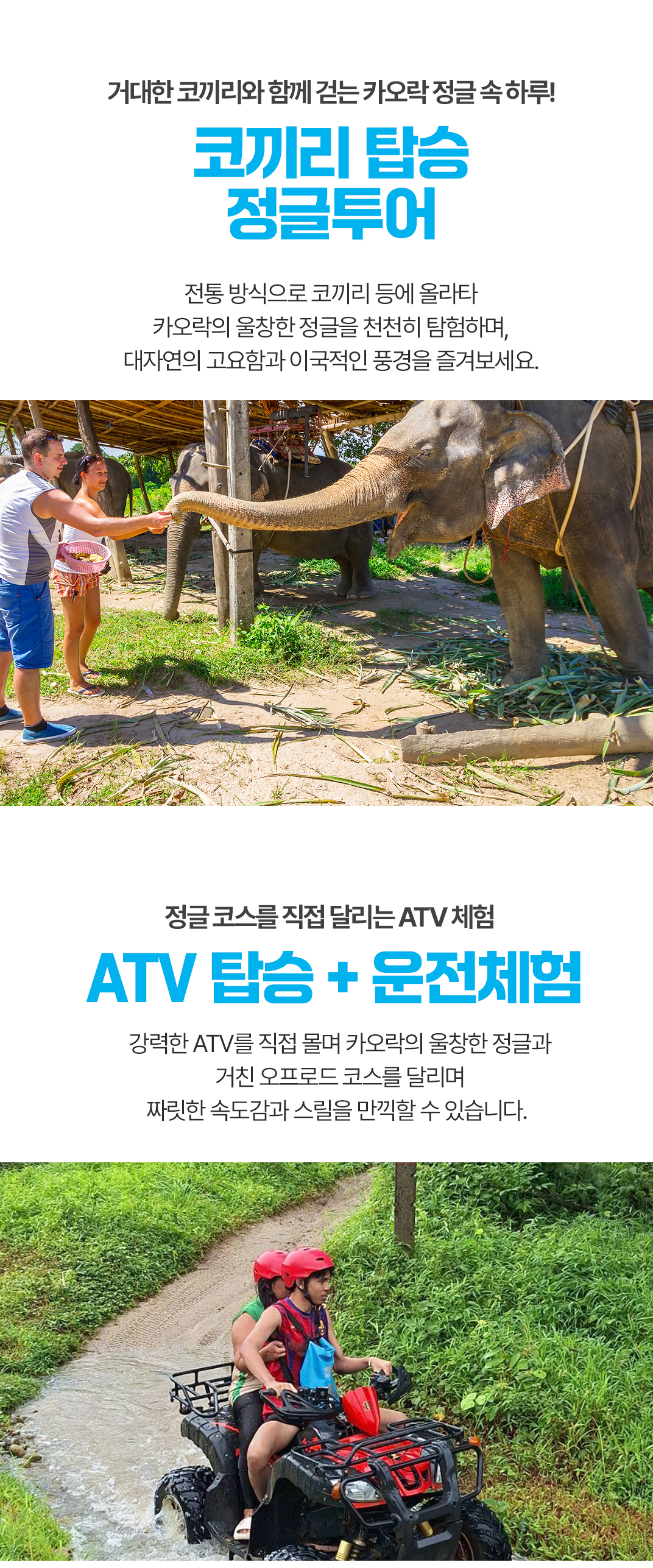 픽업(10:00} → 정글뱀부래프팅 → 보트 래프팅 → 중식 → 코끼리 탑승 정글투어 → ATV탑승&운전체험 → 석식 → 야시장 → 숙소드랍