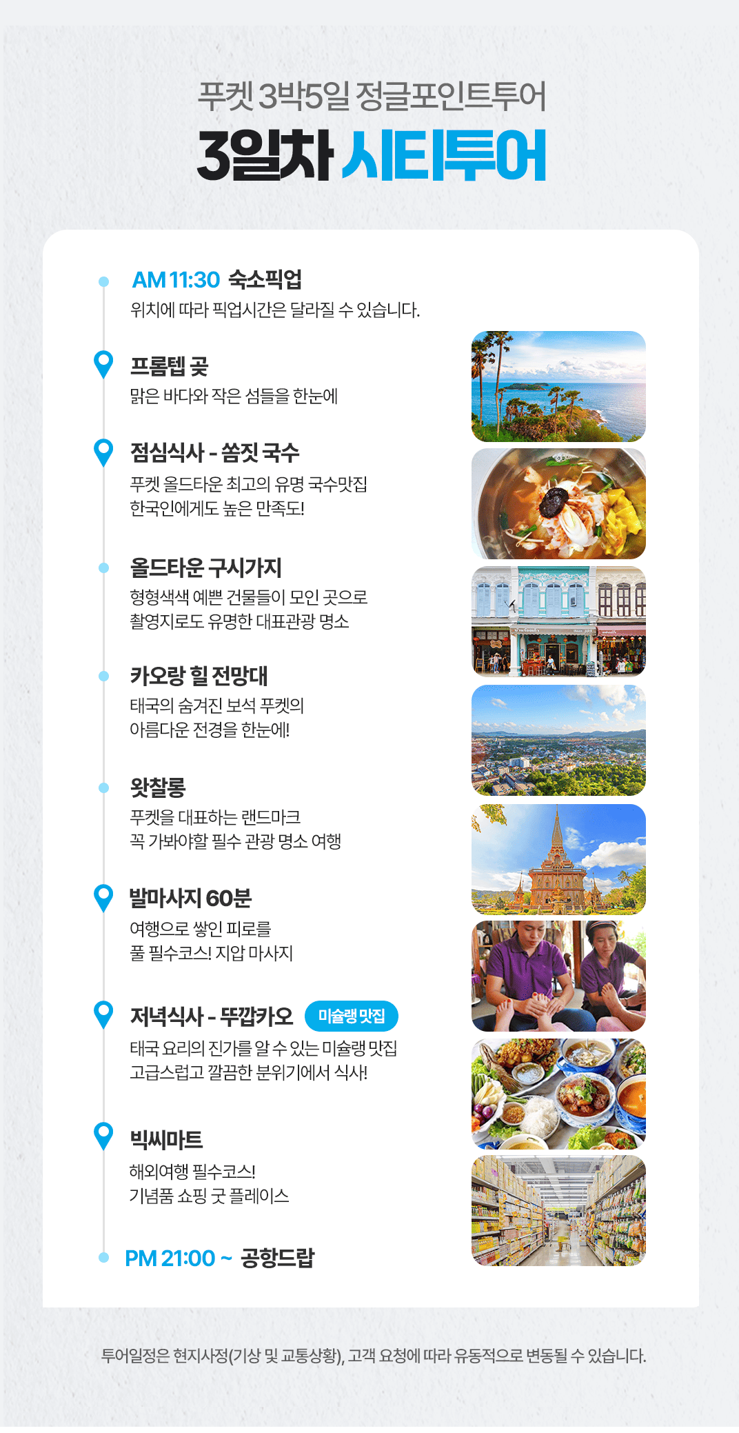 픽업(11:30) → 프롬텝 곶 → 중식 → 올드타운 구시가지→카오랑 힐 전망대→왓찰롱 → 발마사지 60분→석식→ 빅씨마트→ 공항드랍