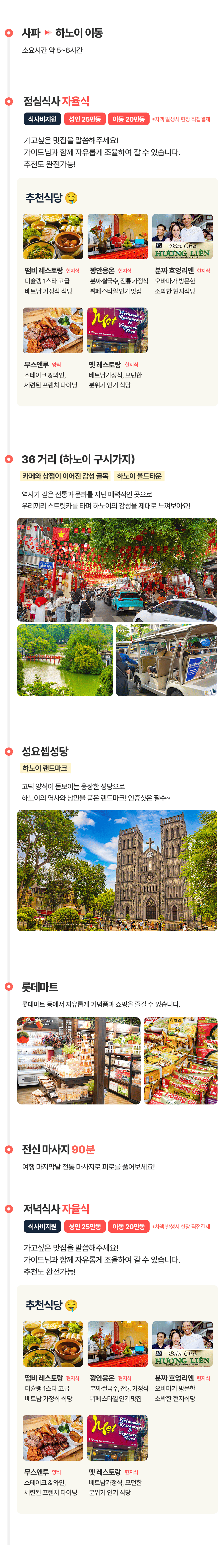 픽업(07:00)→ 하노이로이동(5~6시간) → 중식 → 36거리(구시가지) 및 성요셉성당 → 전신마사지 90분 → 석식 → 숙소드랍(22:00)