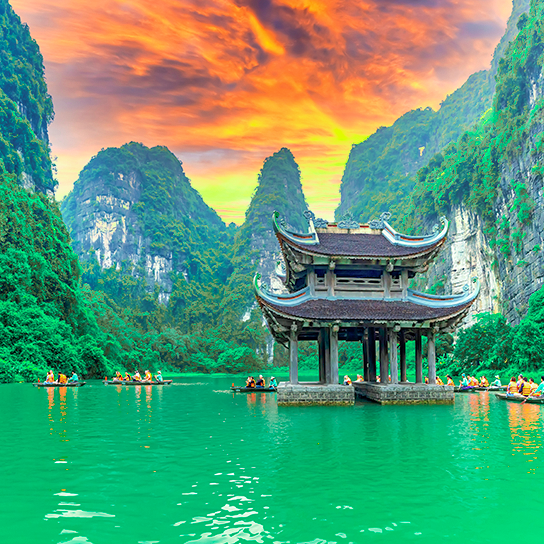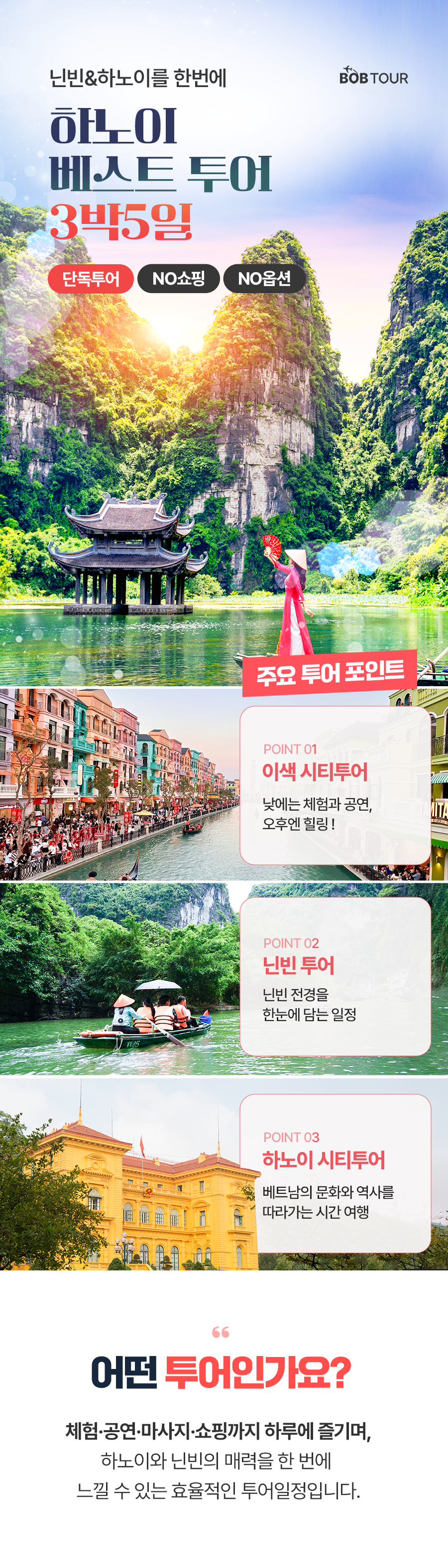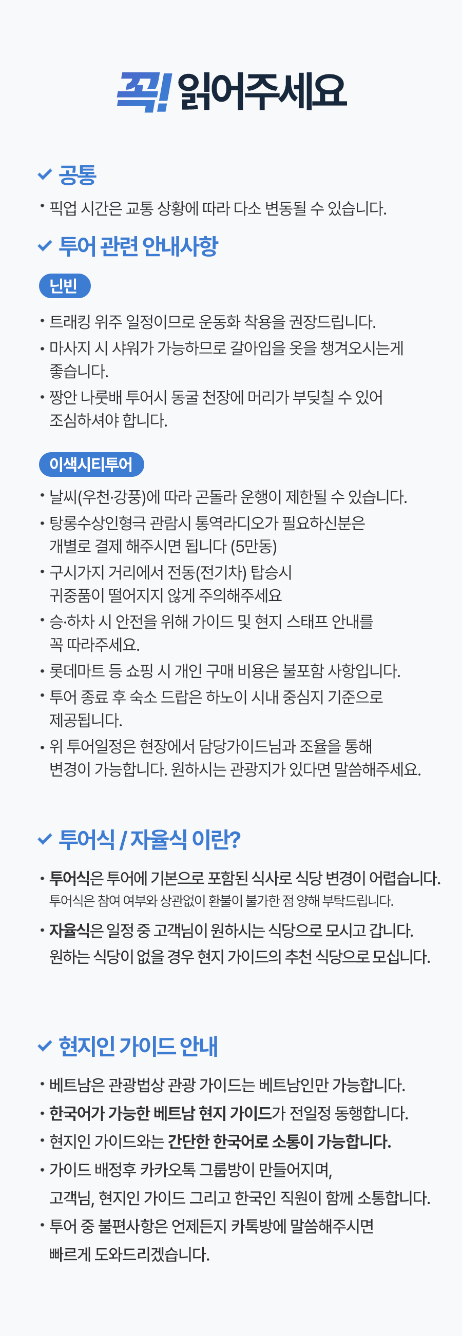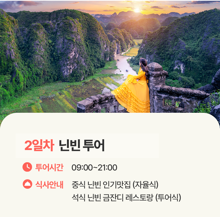 픽업(09:00) → 호아루고대수도 → 중식(자율식) → 짱안 나룻배 비경유람 → 항무아전망대 → 전신마사지 90분 → 석식(투어식) → 닌빈구시가지야경 → 숙소드랍(21:00)