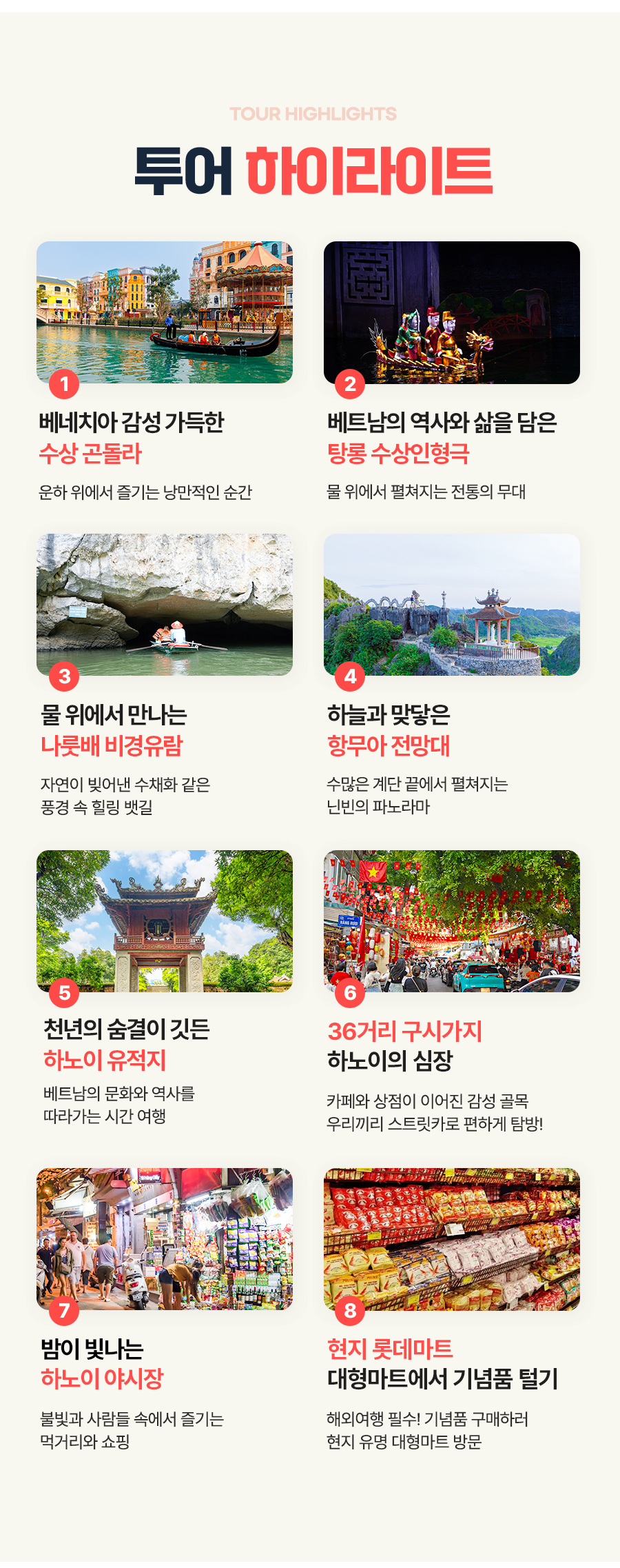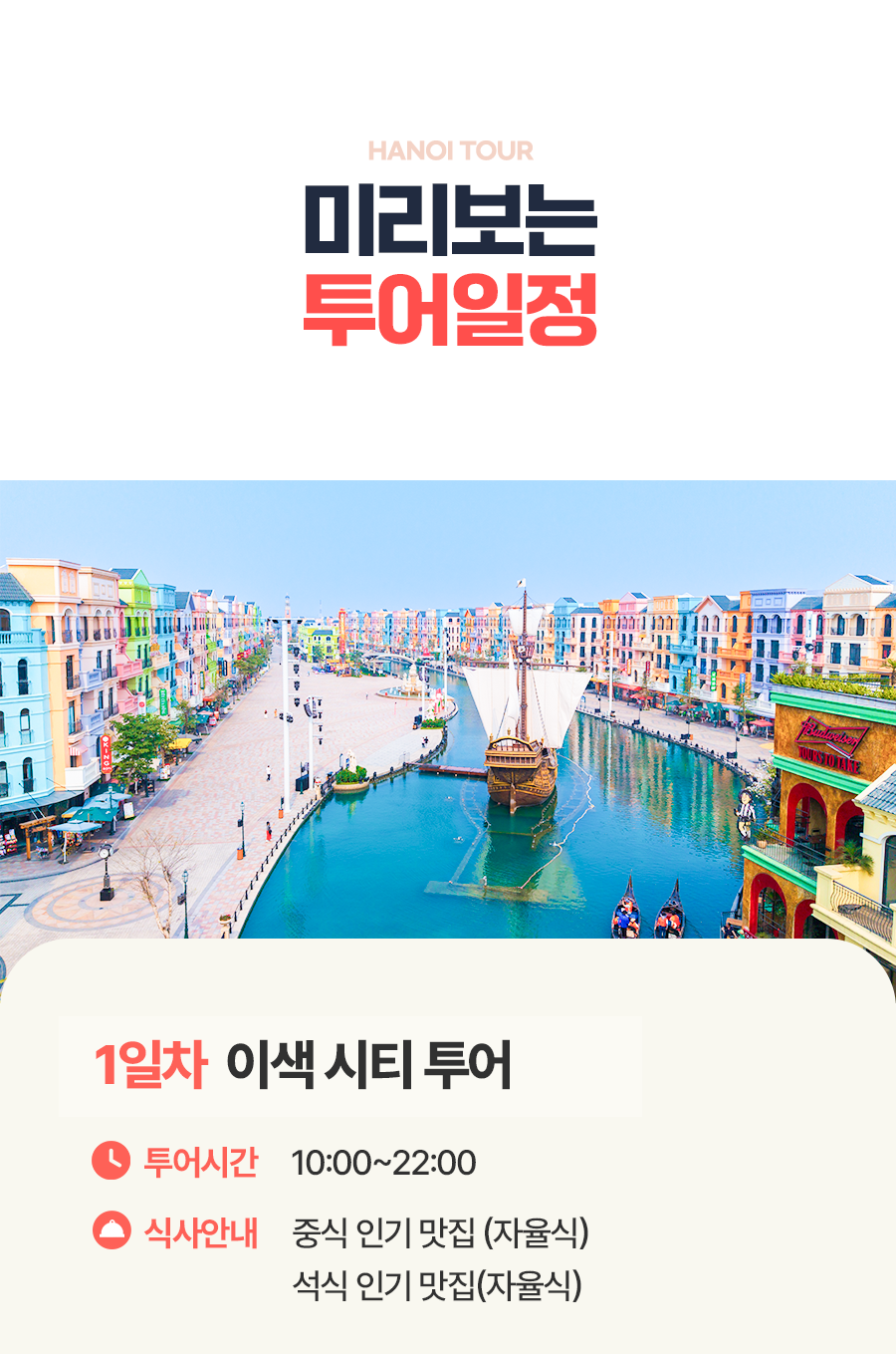 픽업(10:00) → 메가그랜드월드 곤돌라 체험 → 중식(자율식) 및 카페방문 → 탕롱 수상인형극관람 → 롯데마트 → 전신마사지 90분 → 석식(자율식) → 숙소드랍(21:00)