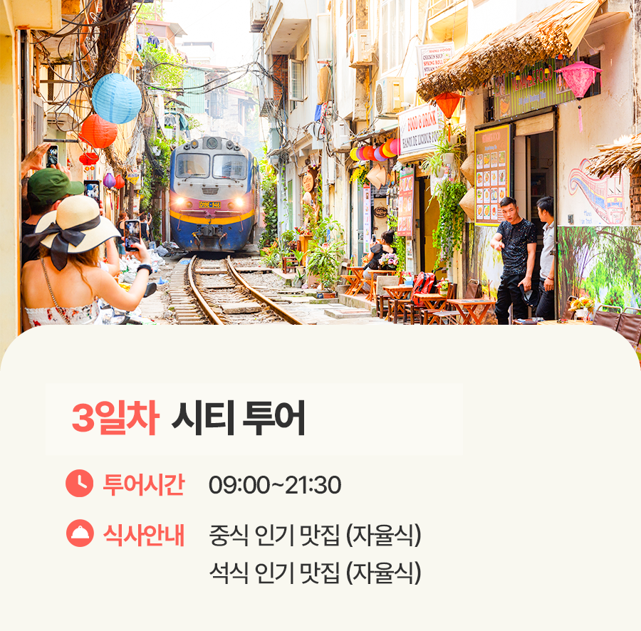 픽업(09:00) → 유적지탐방(문묘/호치민생가) → 중식 및 카페방문 → 36거리 및 성요셉성당 → 롯데마트 → 전신마사지90분 → 기찻길거리 → 석식(자율식) → 숙소or공항 드랍(21:30)