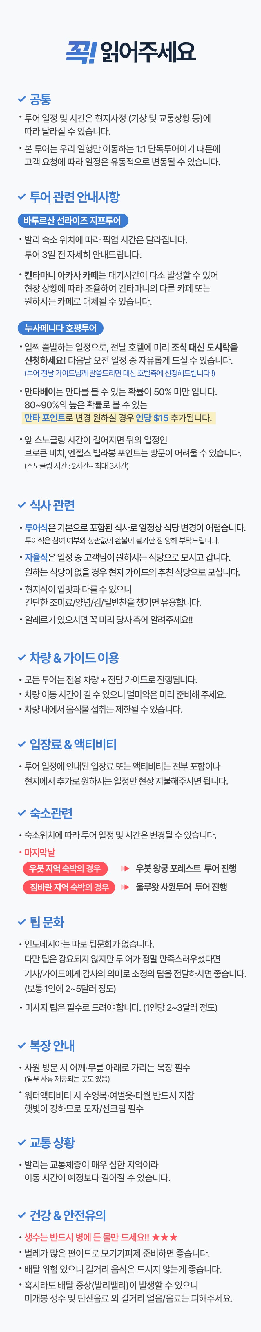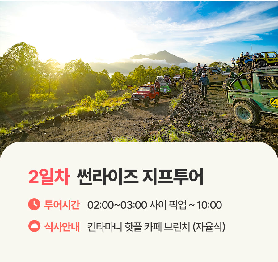 픽업(02:30) → 킨타마니 미팅포인트 도착 → 바투르산 선라이즈 지프투어 → 블랙라바 포인트 감상 → 킨타마니 핫플카페 브런치 식사 → 숙소드랍(10:00)