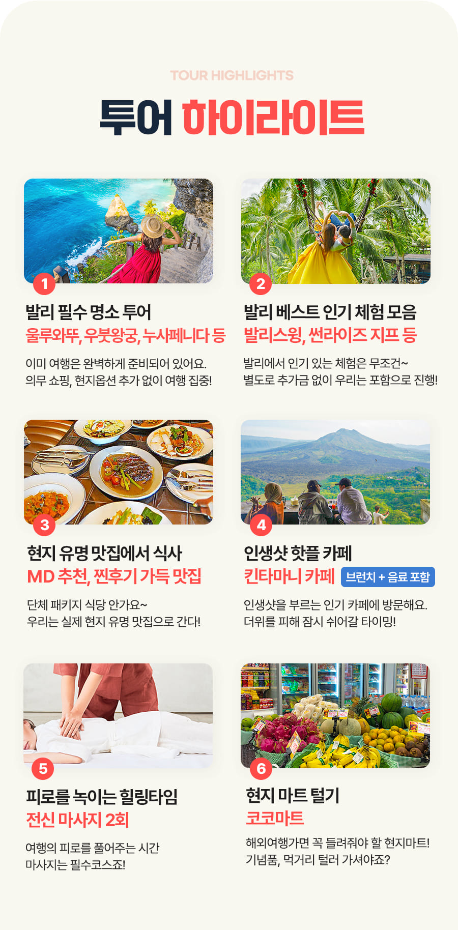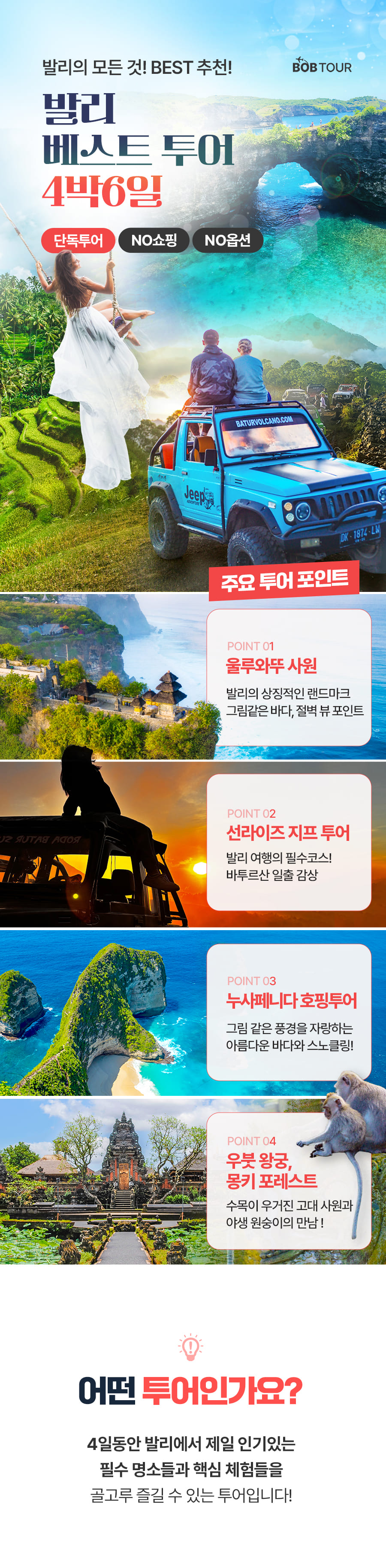 픽업(08:00) → 뜨갈랄랑 계단식 논+발리스윙 → 중식 → 코코마트 → 우붓왕궁&현지시장&몽키포레스트 → 전신마사지60분 → 석식 → 숙소드랍(19:00)