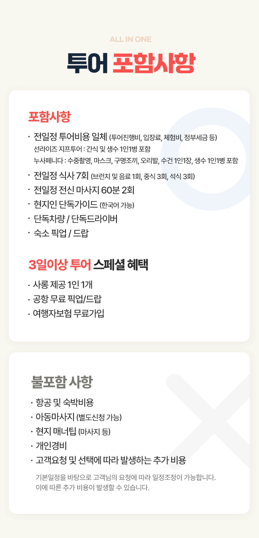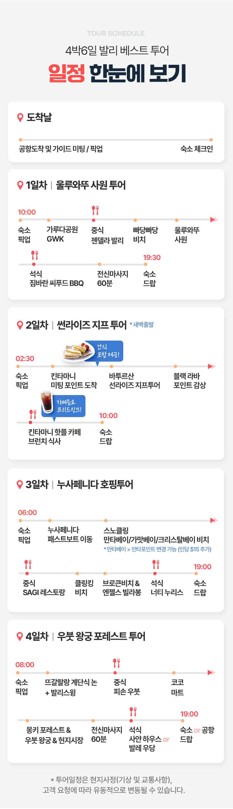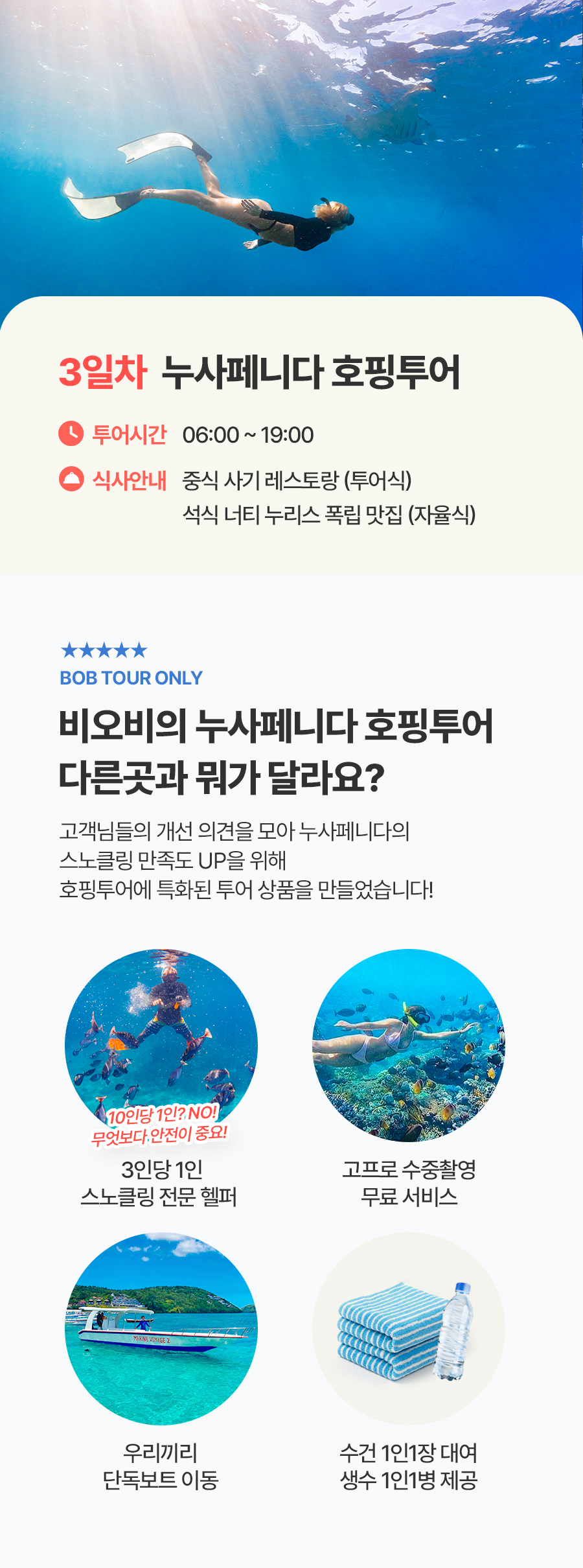 픽업(06:00) → 누사페니다 패스트보트 이동 → 스노클링(반타베이/가맛베이/크리스탈베이 비치 → 중식 → 클링킹 비치 → 브로큰비치&엔젤스 빌라봉 → 석식 → 숙소드랍(19:00)