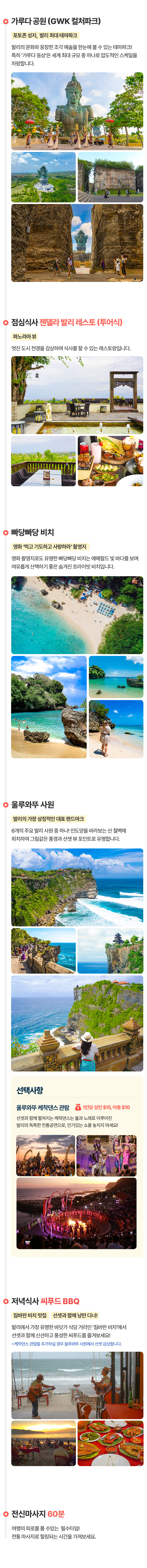 픽업(10:00) → 가루다공원 GWK → 중식 → 빠당빠당비치 → 울루와뚜 사원 → 석식 → 전신마사지60분 → 숙소드랍(19:30)