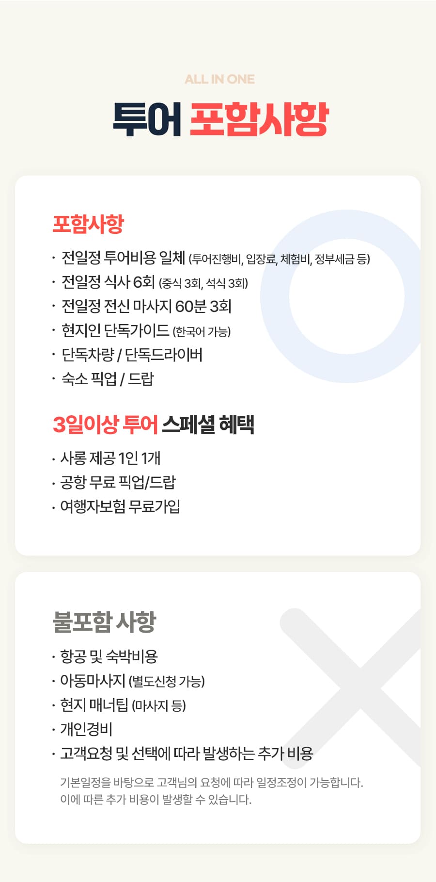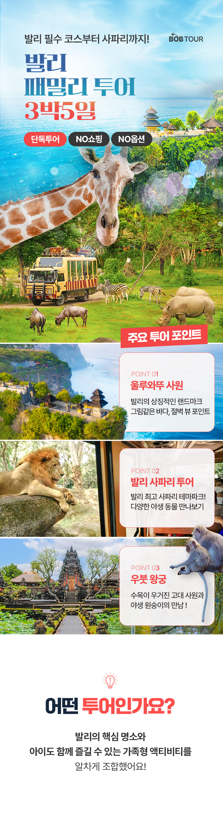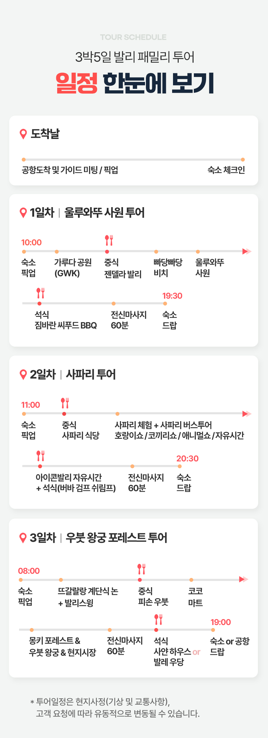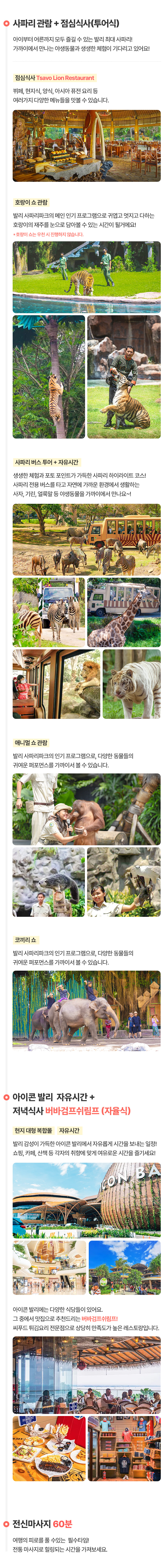 픽업(11:00) → 중식 → 사파리 체험 + 사파리 버스투어 + 아이콘발리 자유시간 → 석식 → 전신마사지 60분 → 숙소드랍(20:30)