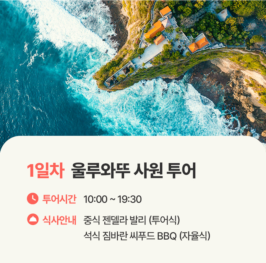 픽업(10:00) → 가루다공원GWK → 중식 → 빠당빠당비치 → 울루와뚜 사원 → 석식 → 전신마사지 60분 → 숙소드랍(19:30)