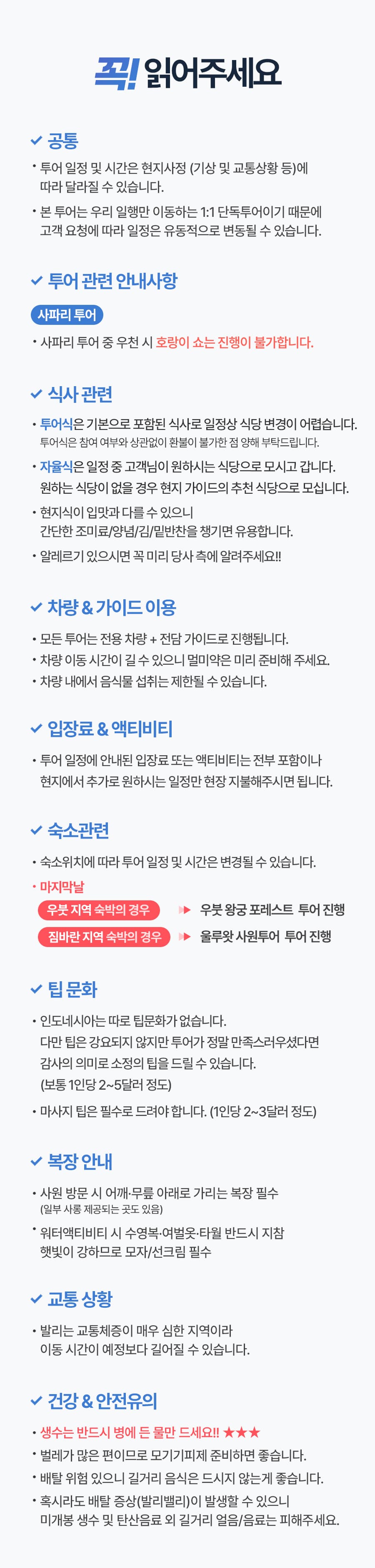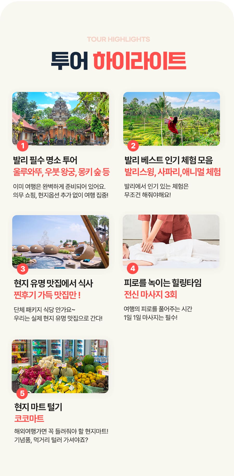 픽업(08:00) → 뜨갈랄랑 계단식 논 + 발리스윙 → 중식 → 코코마트 → 우붓왕궁&현지시장&몽키포레스트 → 전신마사지 60분 → 석식 → 숙소 또는 공항드랍(19:00)
