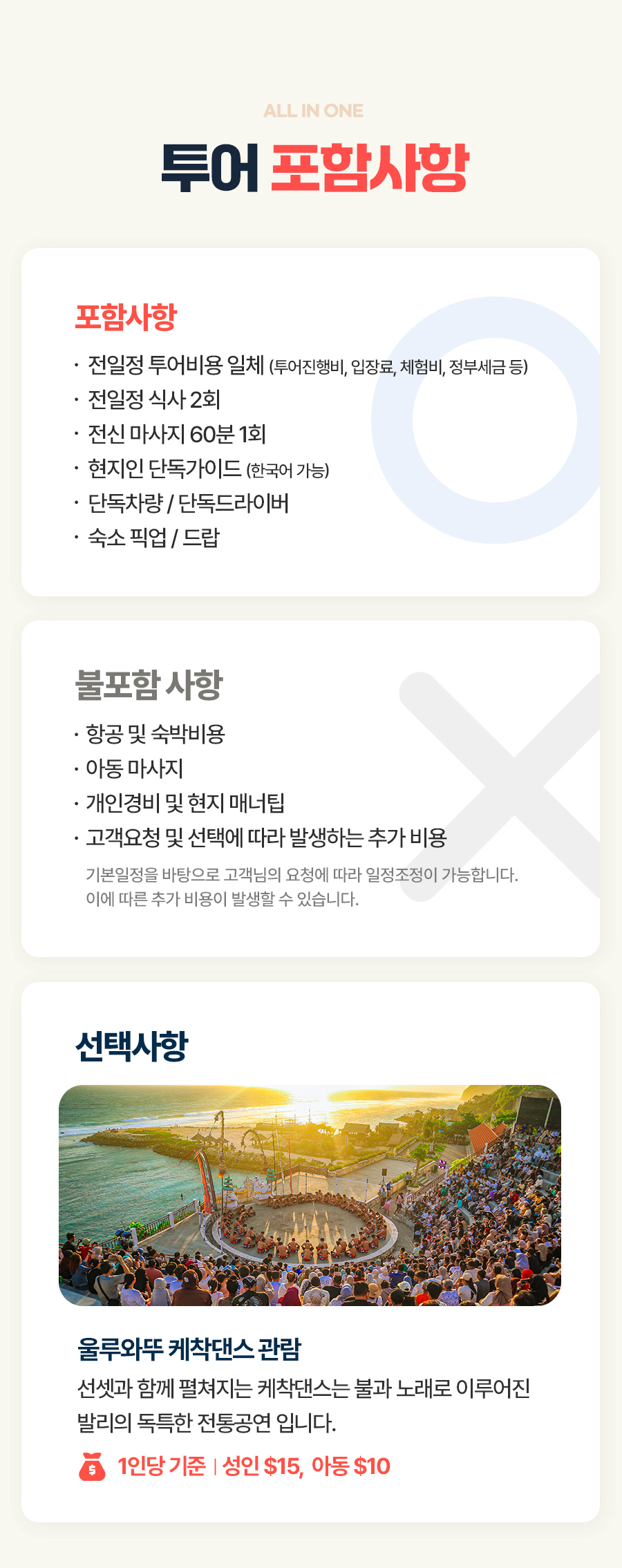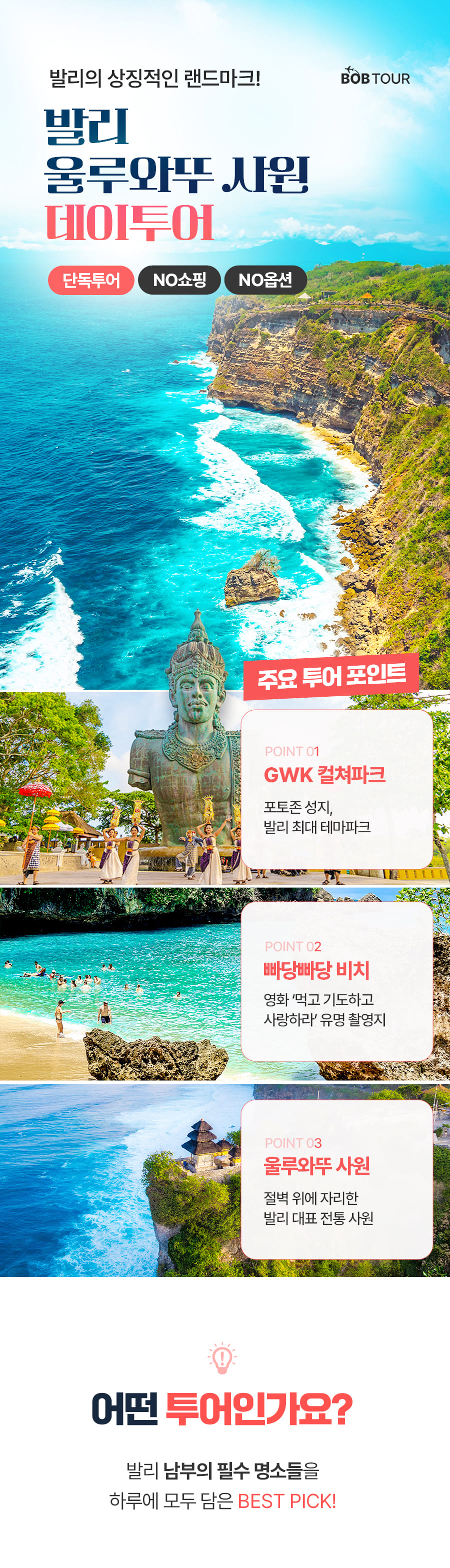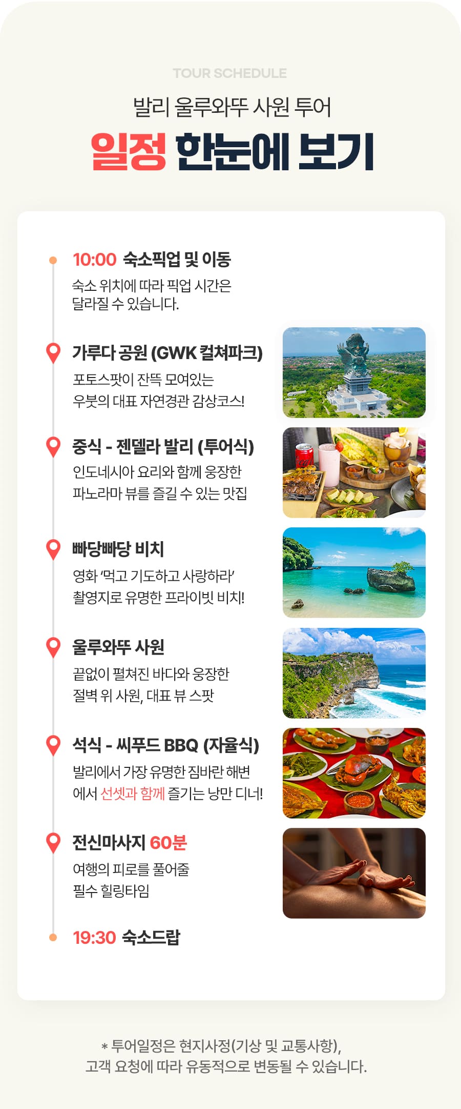 10:00픽업 → GWK 컬쳐파크 → 중식 → 빠당빠당비치 → 울루와뚜 사원 → 짐바란 석양 감상 → 석식 → 60분 전신마사지 → 숙소드랍