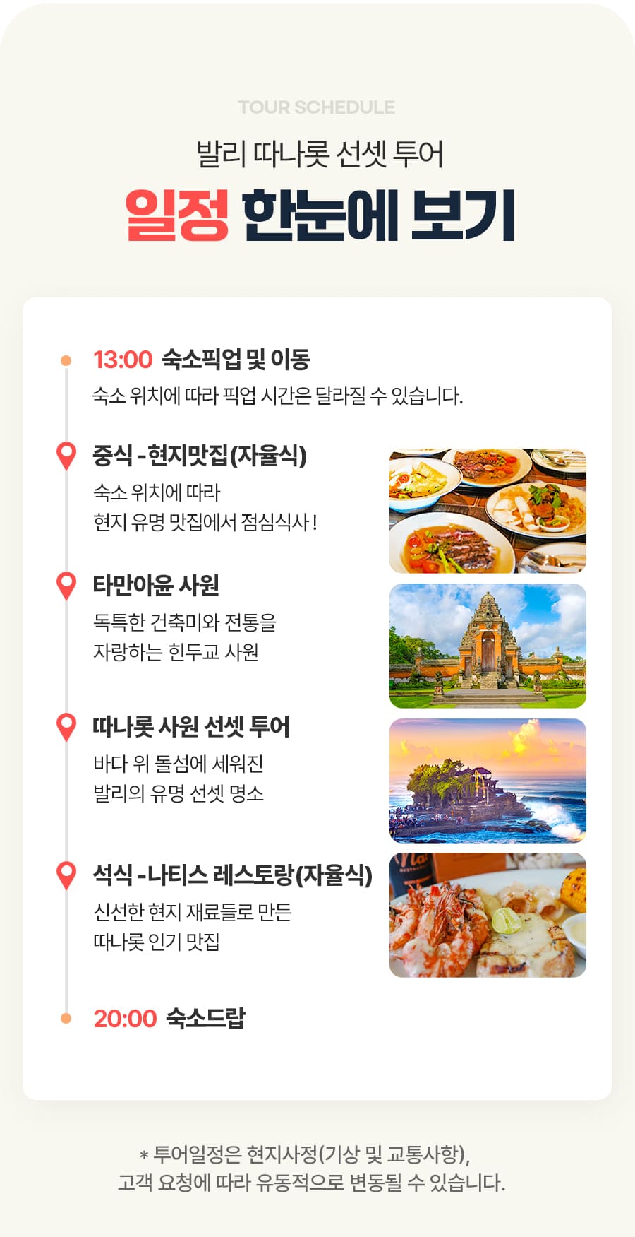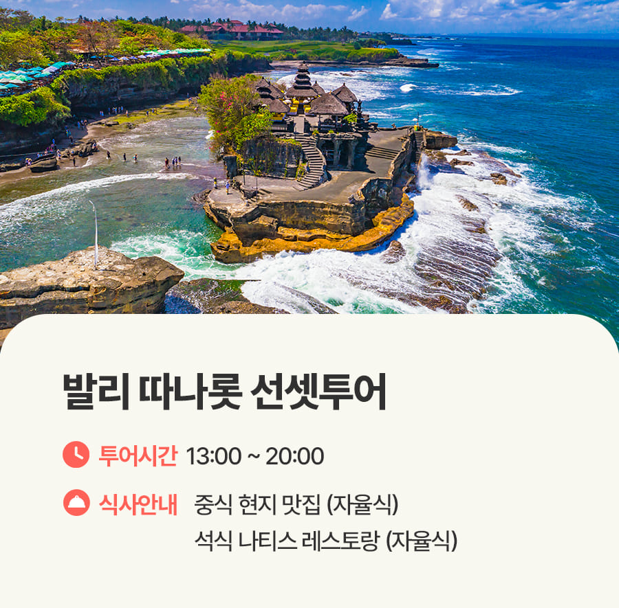13:00픽업 → 중식 → 따만아윤사원 → 따나롯 선셋투어 → 석식 → 숙소드랍
