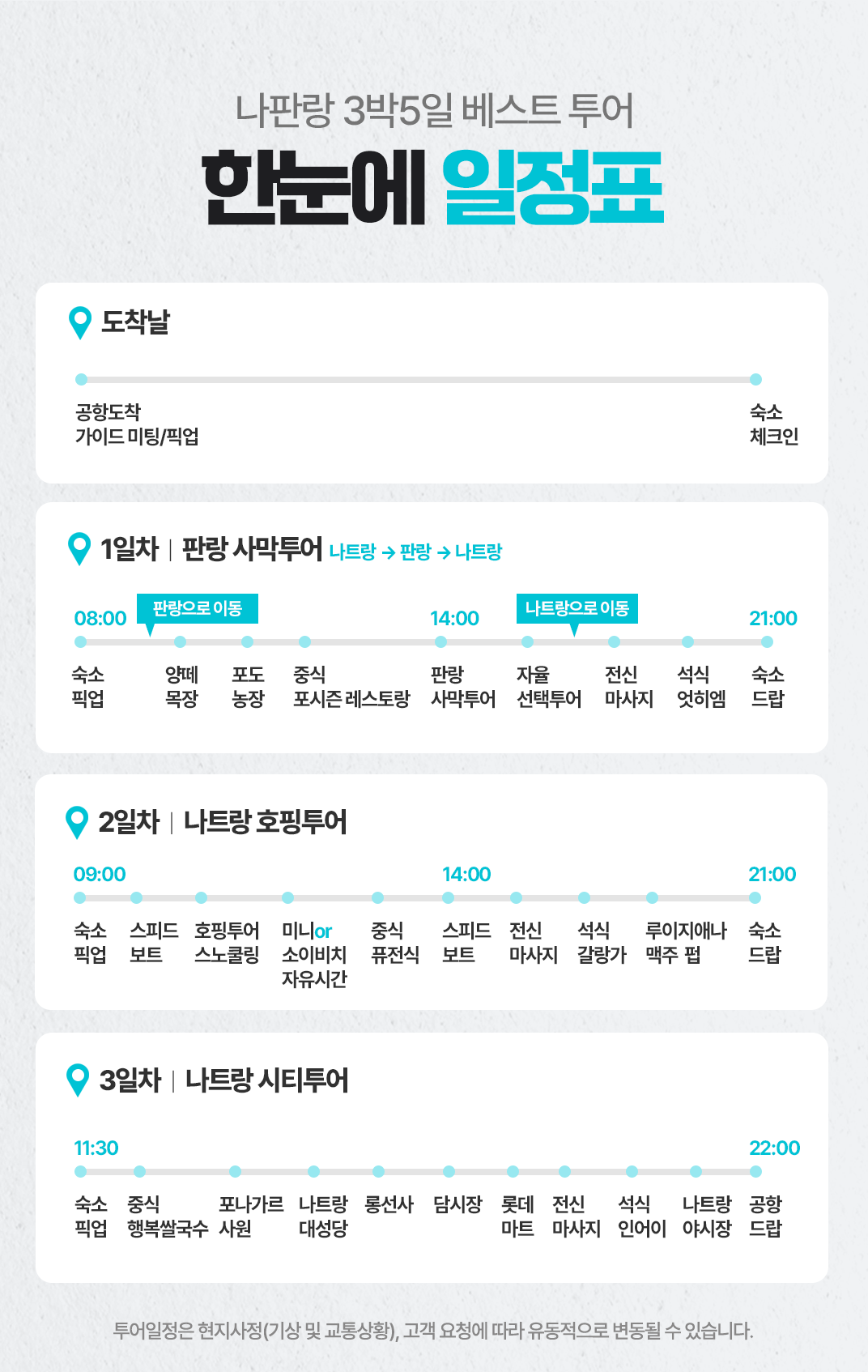 📢 나트랑 시내 숙소 기준이며 깜란지역, 혼총지역, 빈펄섬 지역은 픽드랍 추가금이 발생합니다.