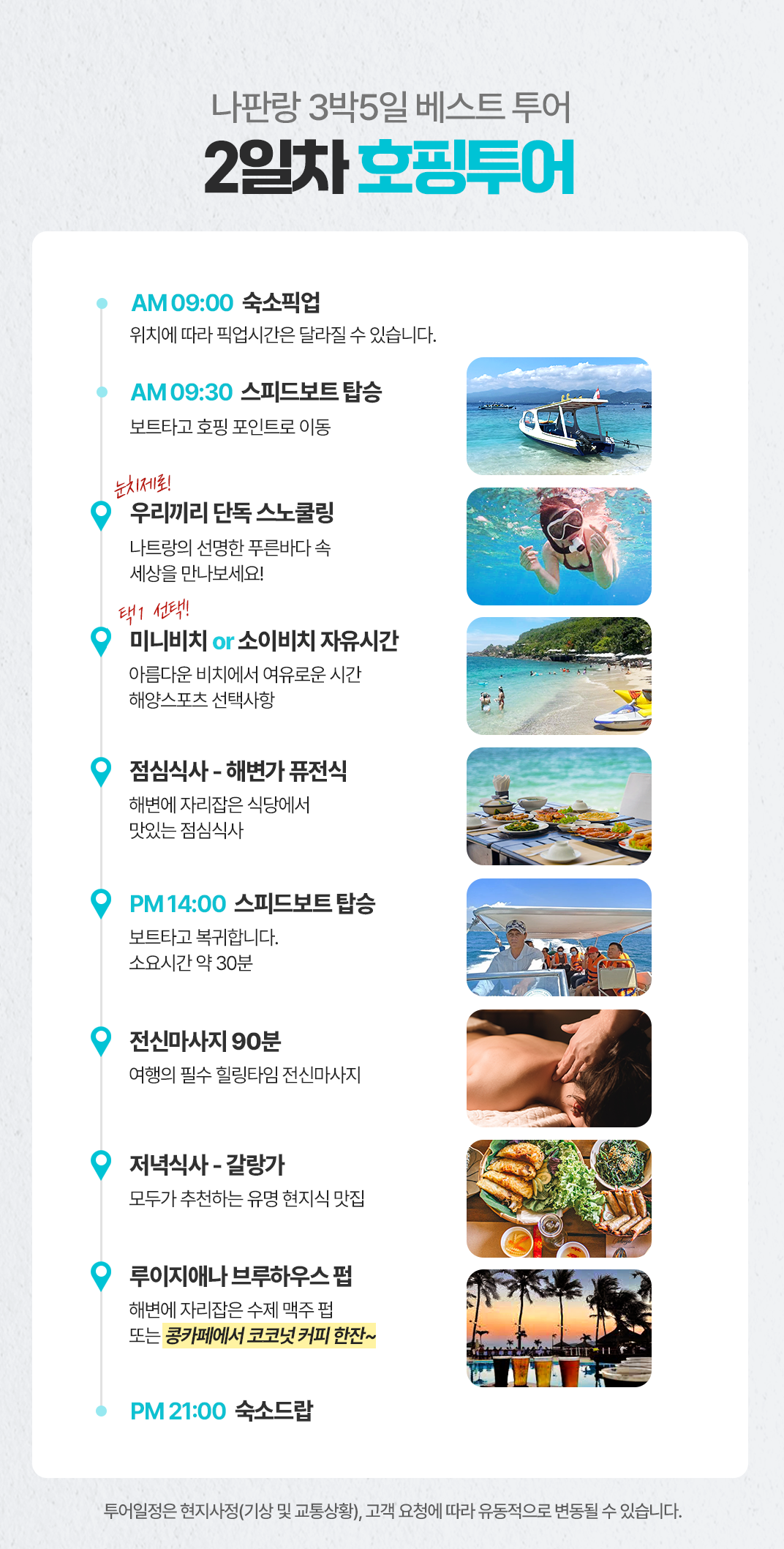 픽업(09:00) → 스노클링 및 섬 내 중식(09:00~13:30)→마사지(13:30~16:00)→석식(16:00~18:00)→루이지애나 펍(18:00~20:00)→ 리조트 드랍
