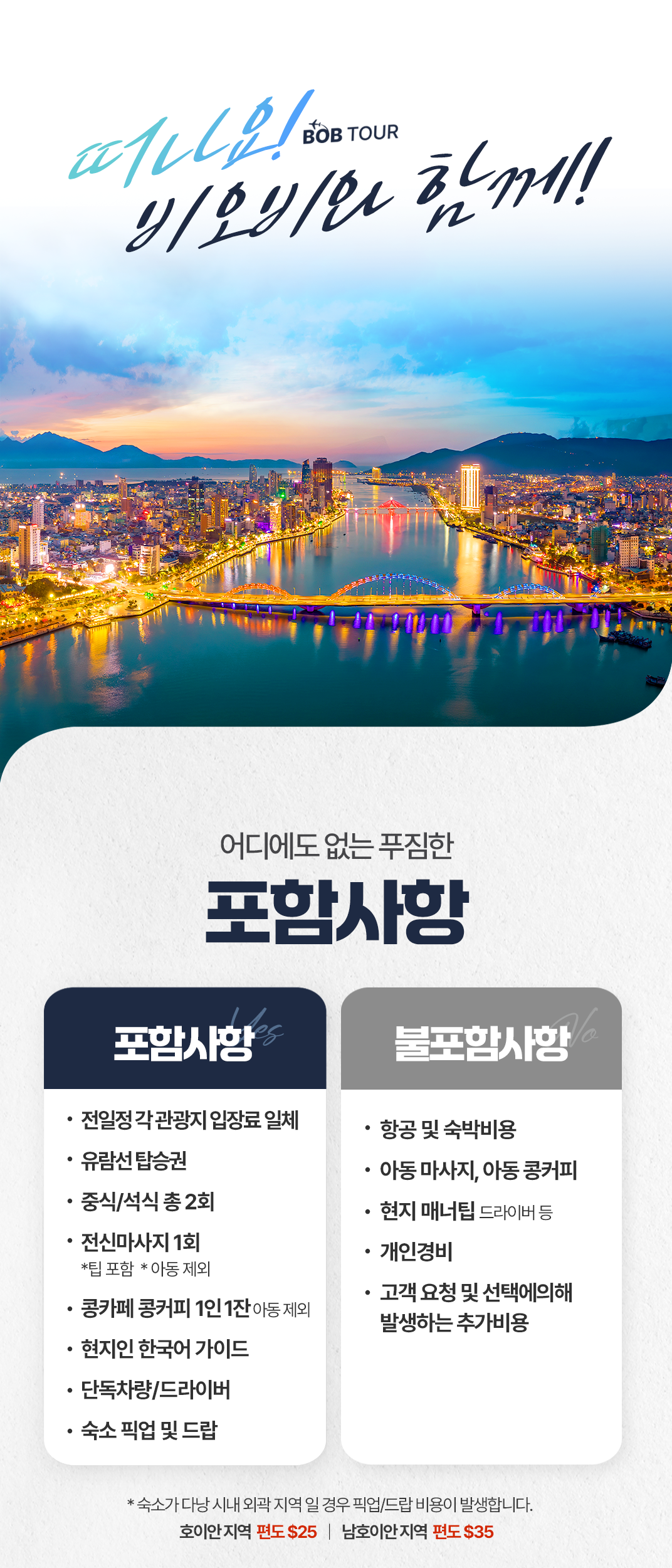- 숙소가 다낭시내 외곽지역 일 경우 추가비용(호이안지역 편도 $25 / 남호안 지역 편도 $35)