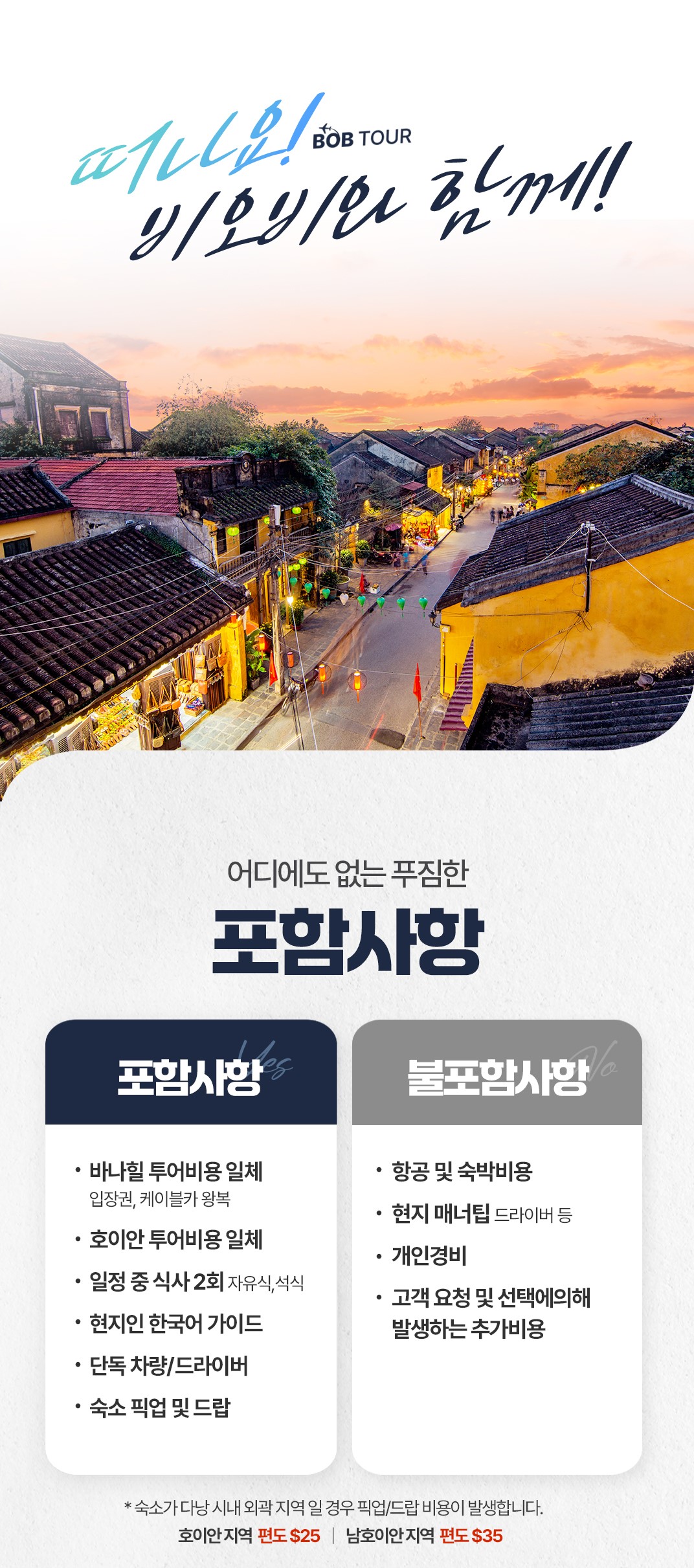 - 숙소가 다낭시내 외곽지역 일 경우 추가비용(호이안지역 편도 $25, 남호이안 지역 편도 $35)