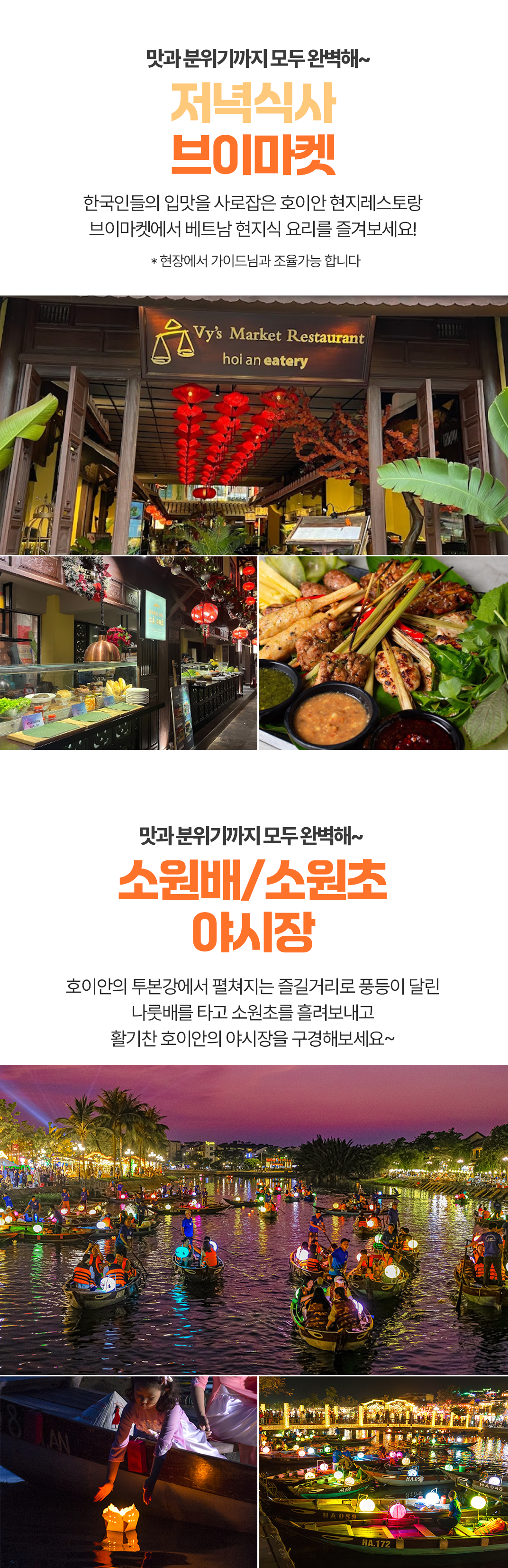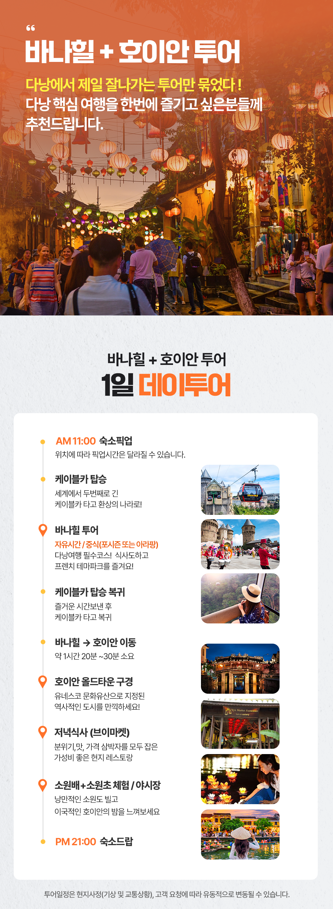 픽업(11:00) → 바나힐 도착후 케이블카 탑승후 이동 → 점심식사 → 바나힐 자유시간 → 바나힐에서 호이안으로 이동 → 호이안 올드타운 구경 → 저녁식사 → 소원초&소원배 체험/야시장 → 리조트드랍