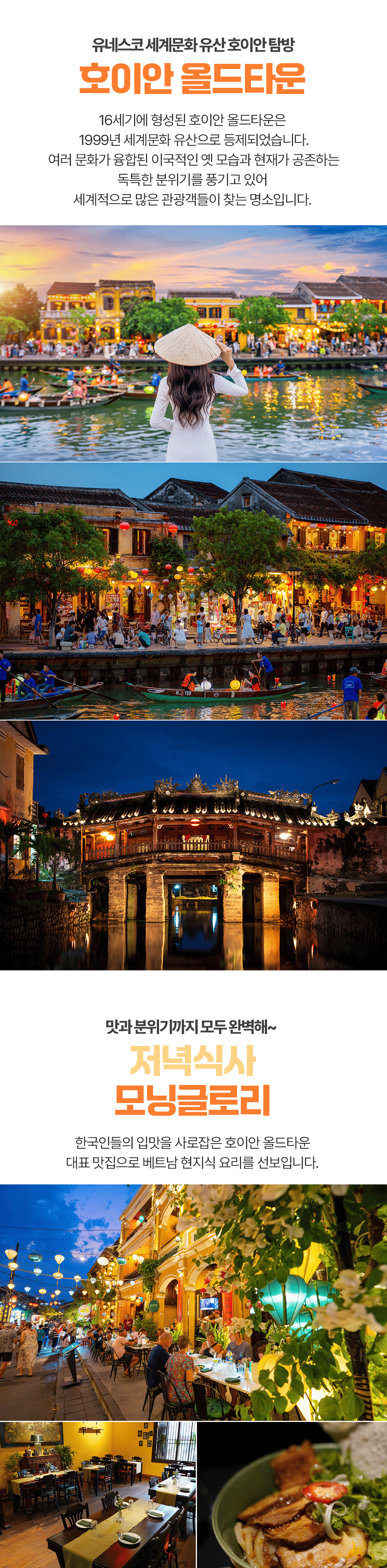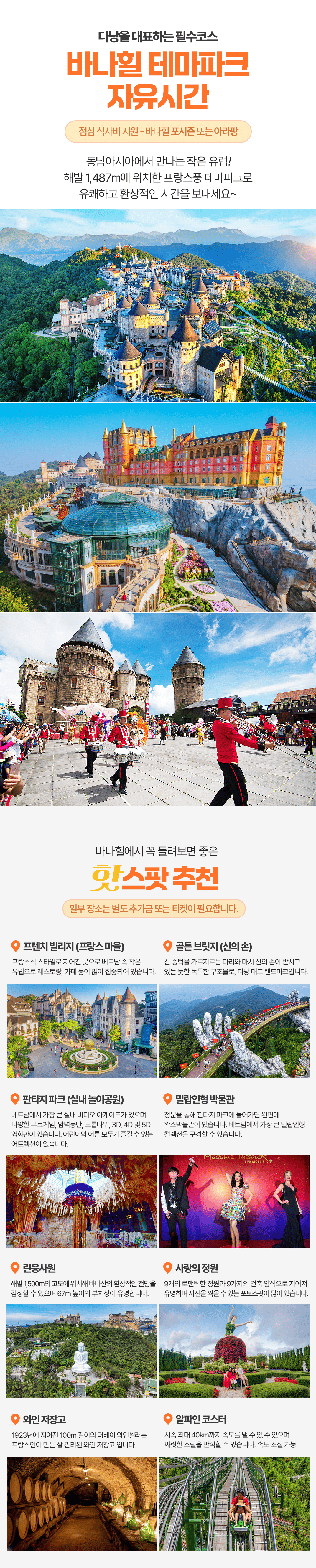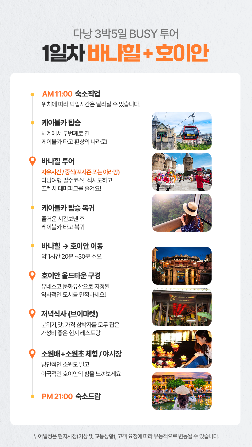 픽업(11:00) → 바나힐 도착후 케이블카 탑승후 이동 → 점심식사 → 바나힐 자유시간 → 바나힐에서 호이안으로 이동 → 호이안 올드타운 구경 → 저녁식사 → 소원초&소원배 체험/야시장 → 리조트드랍