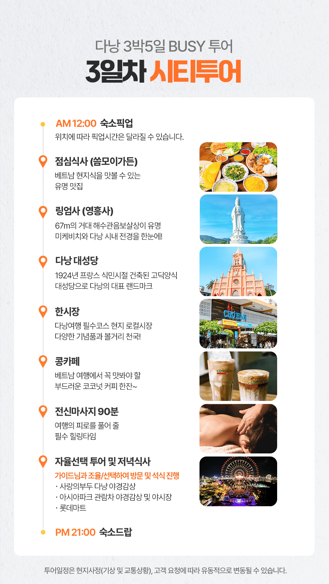 픽업(12:00) → 점심식사 → 링엄사(영흥사) → 다낭대성당 → 한시장 → 콩카페 → 전신마사지90분 → 저녁식사 → 리조트 OR 공항드랍