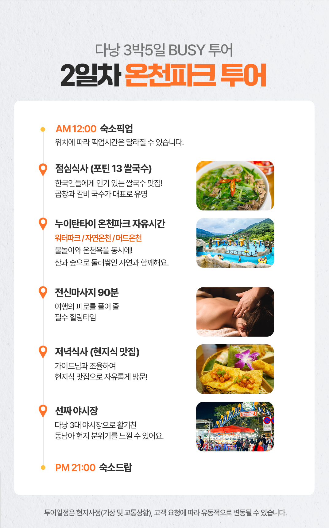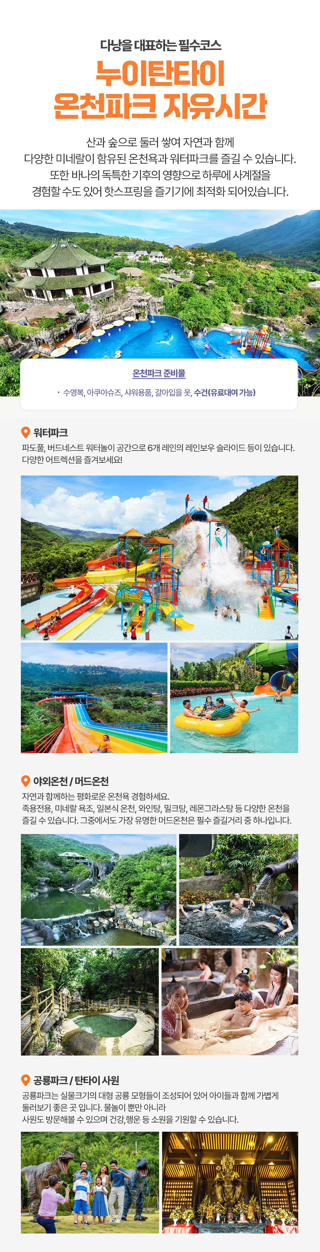 픽업(12:00) → 점심식사 → 누이탄타이 온천파크 자유시간 → 전신마사지(90분) → 저녁식사(현지식 맛집) → 선짜야시장 → 리조트 드랍(21:00)