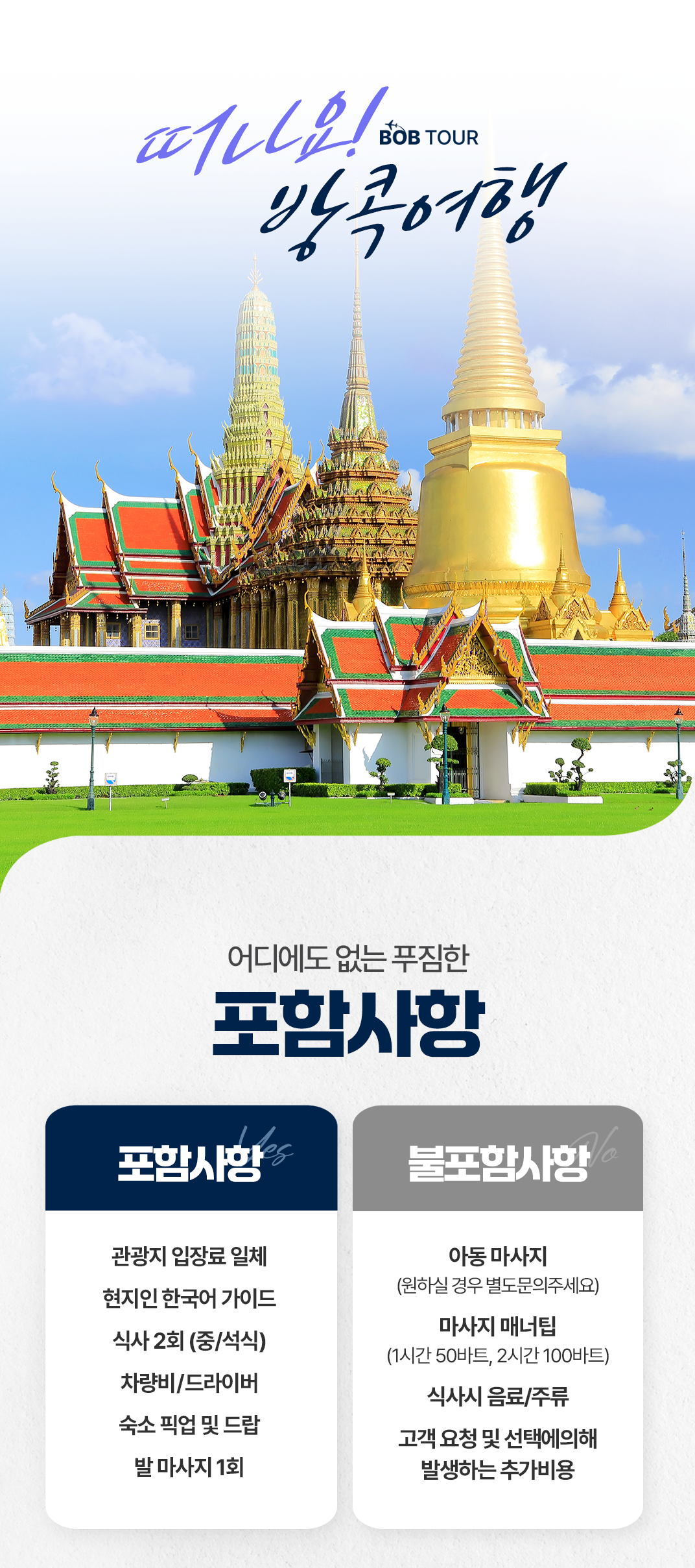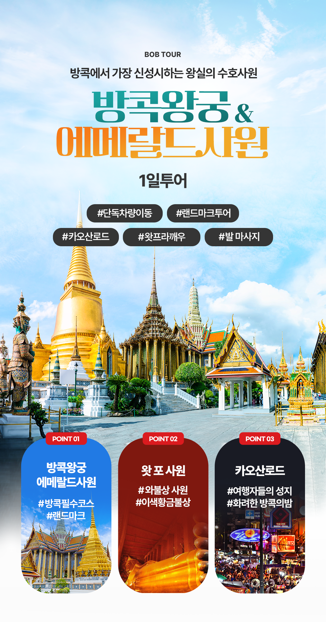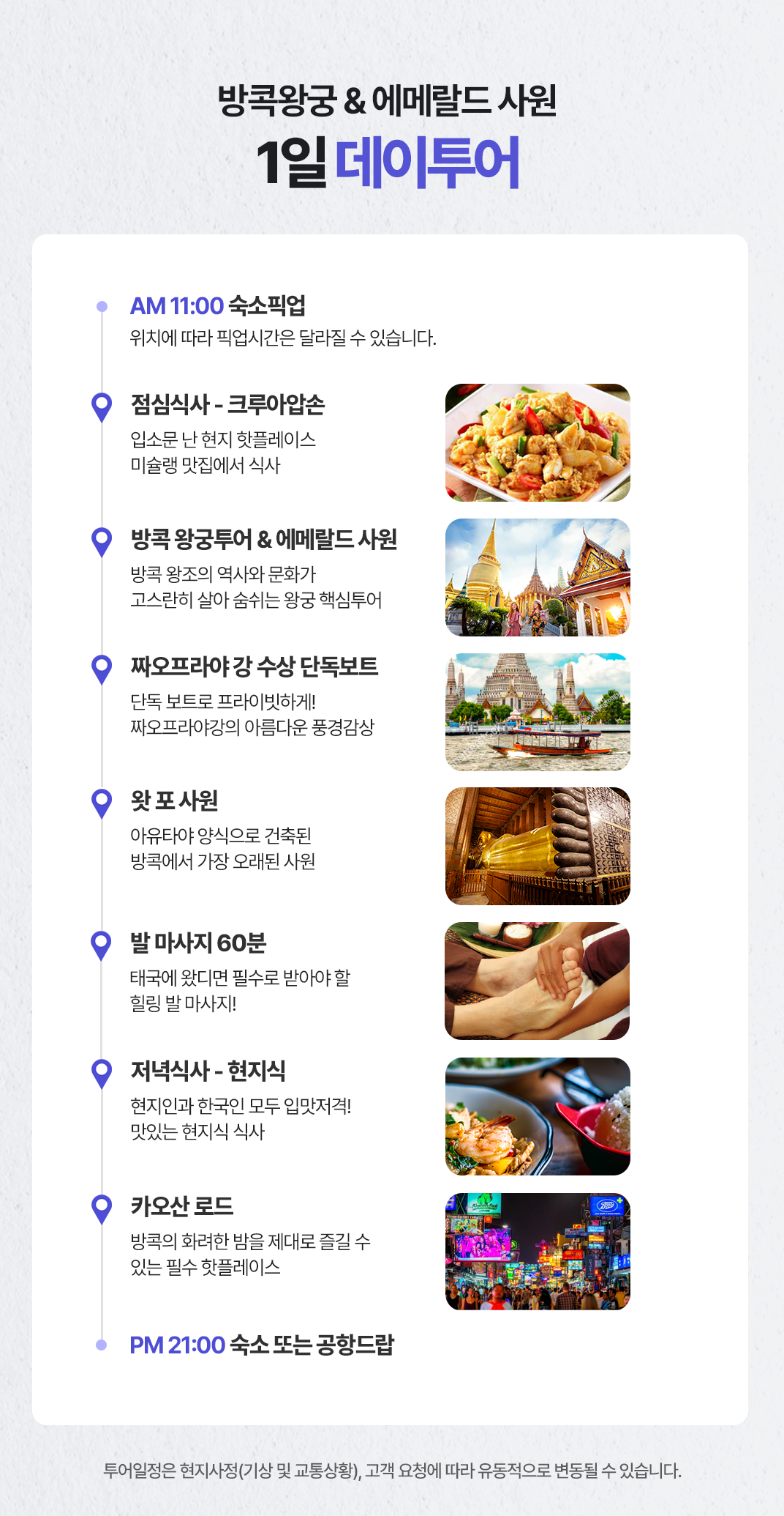 픽업(11:00) → 점심식사 → 방콕 왕궁투어 & 에매랄드 사원 → 짜오프라야 강 수상 단독보트 → 왓 포 사원 → 발 마사지 60분 → 저녁식사 → 카오산 로드 → 드랍(21:00)