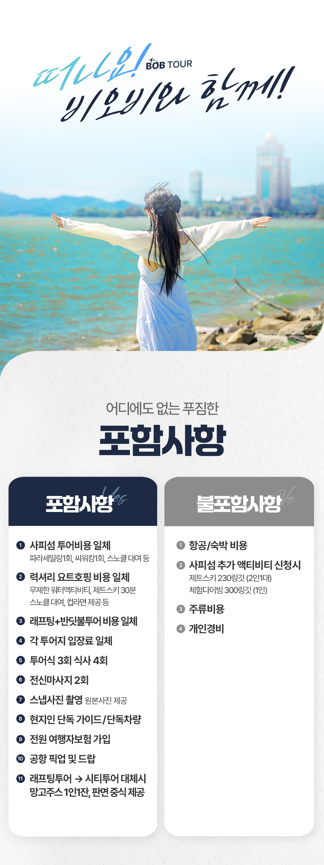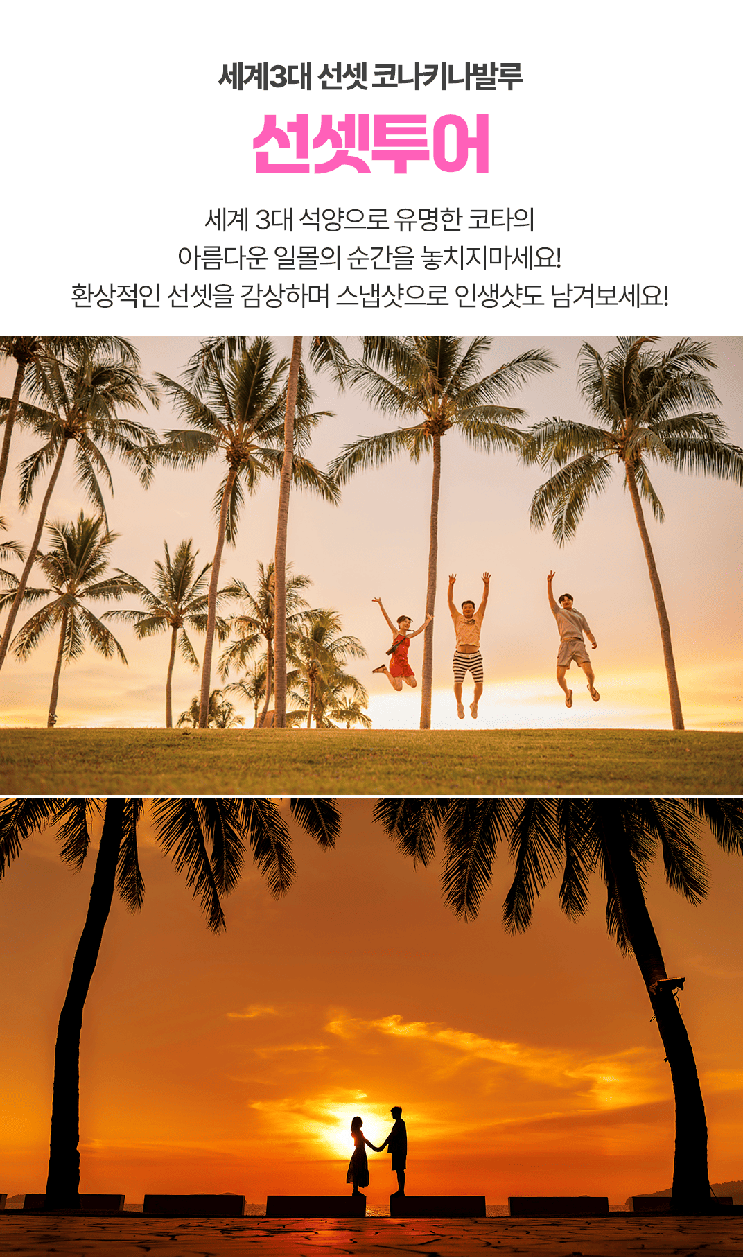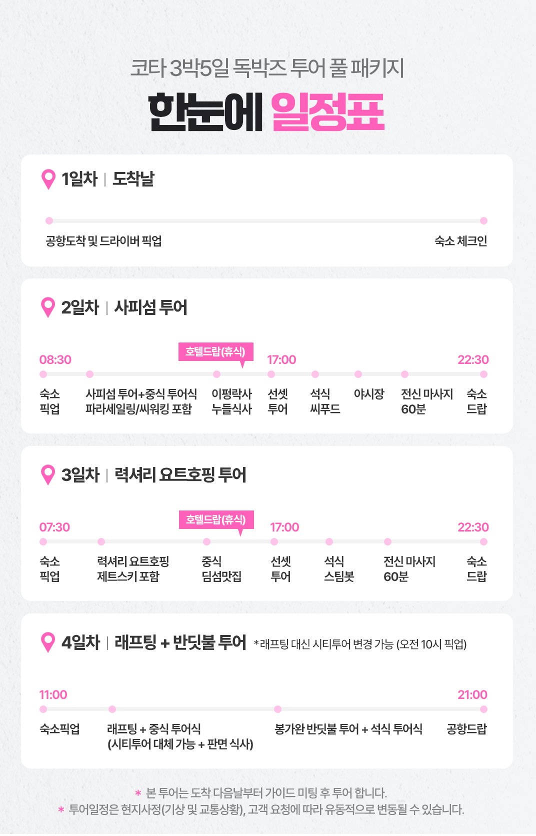 숙소 픽업(7:30) → 럭셔리 요트호핑(컵라면 제공)+점심식사(투어식) →숙소 드랍(15:00)→선셋투어(18:00)→저녁식사(투어식)→전신마사지60분→숙소드랍(22:30)