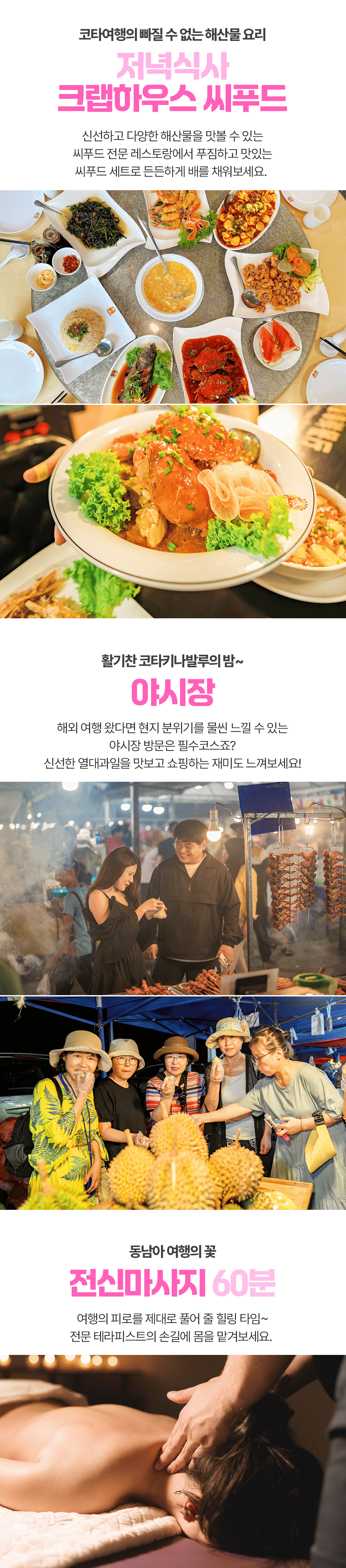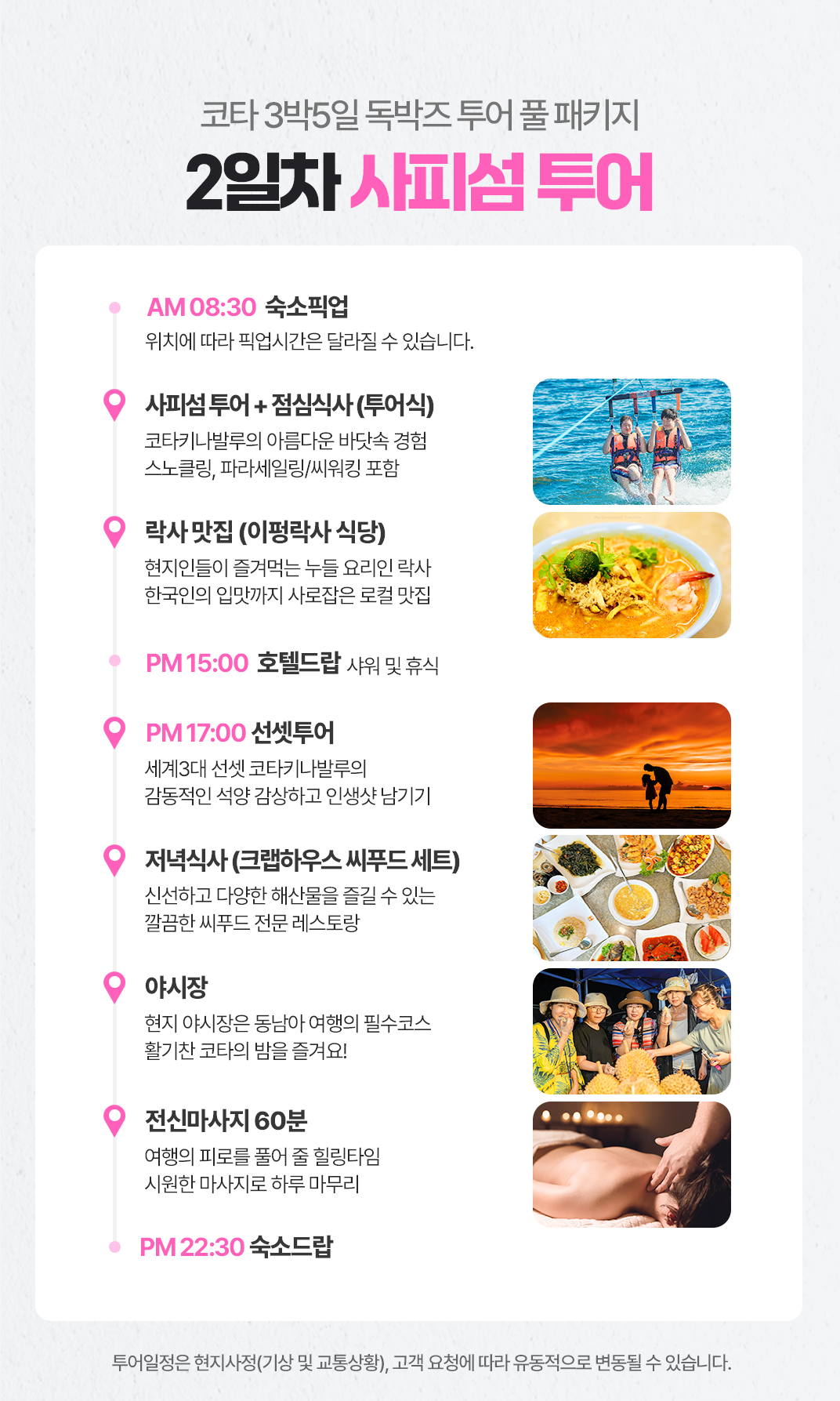 픽업(08:30) → 사피섬 투어(09:00~14:00)+점심식사(투어식, 이펑락사 식당)→ 숙소 드랍(15:00) → 선셋투어(17:00)→저녁식사(크랩하우스 씨푸드 세트)→야시장, 전신마사지 60분 →숙소드랍(22:30)