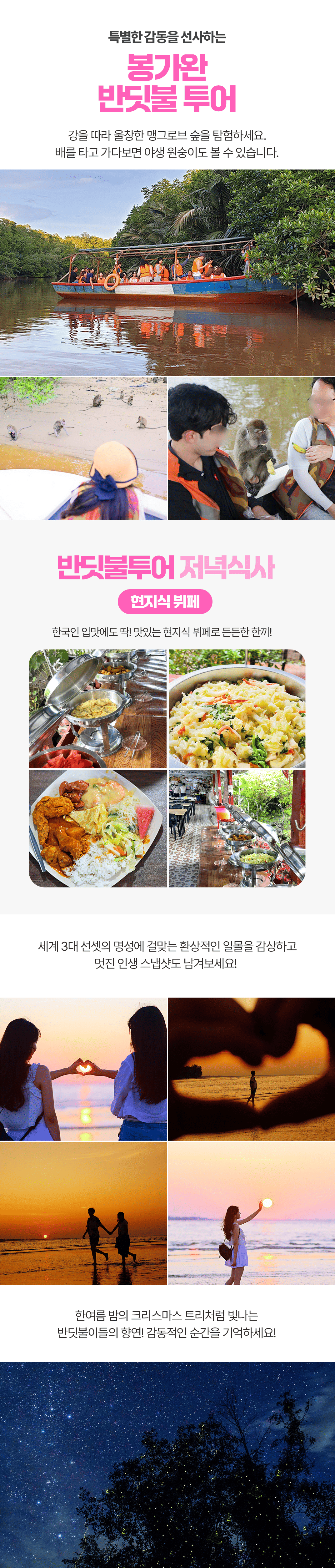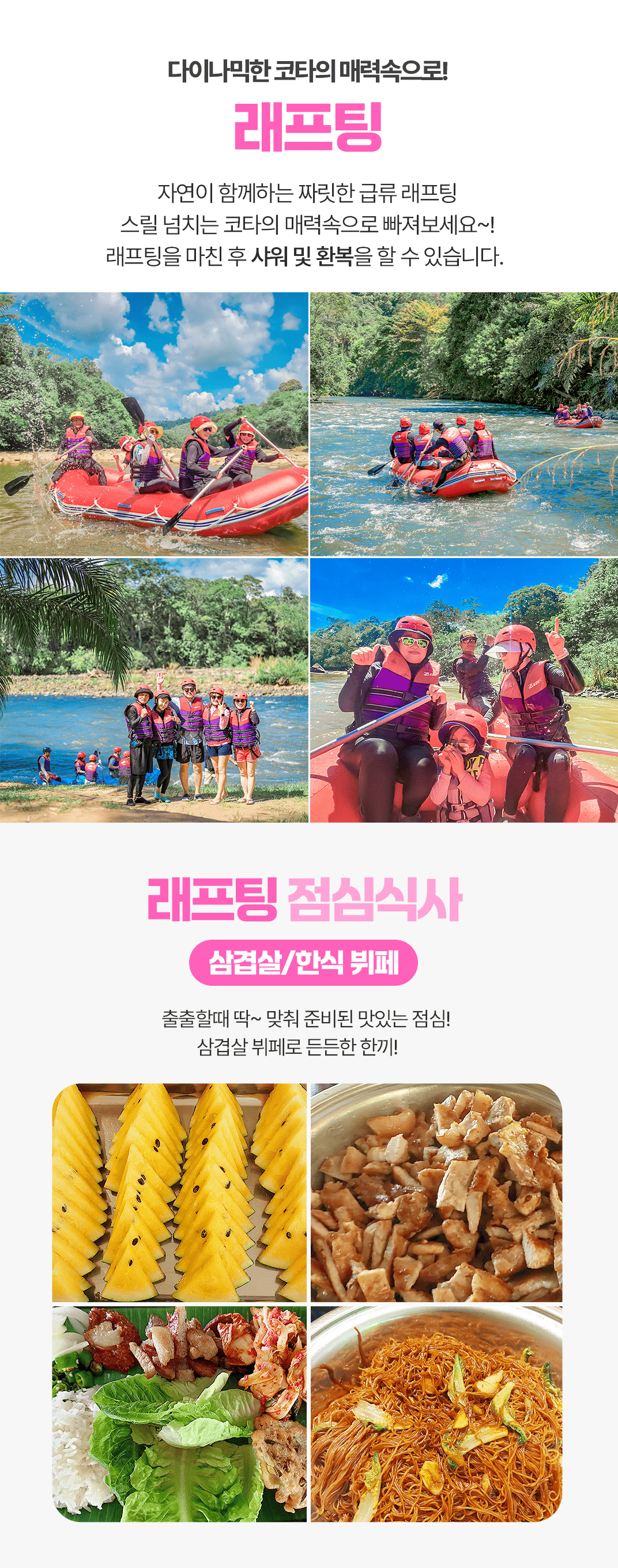 숙소 체크아웃 및 픽업(11:00) → 래프팅+점심식사(투어식) →봉가완 반딧불투어+저녁식사(투어식)→원숭이 와칭, 선셋, 반딧불 와칭→공항드랍(21:00)